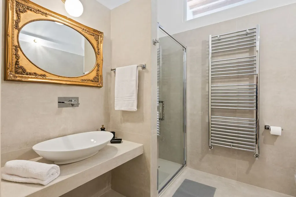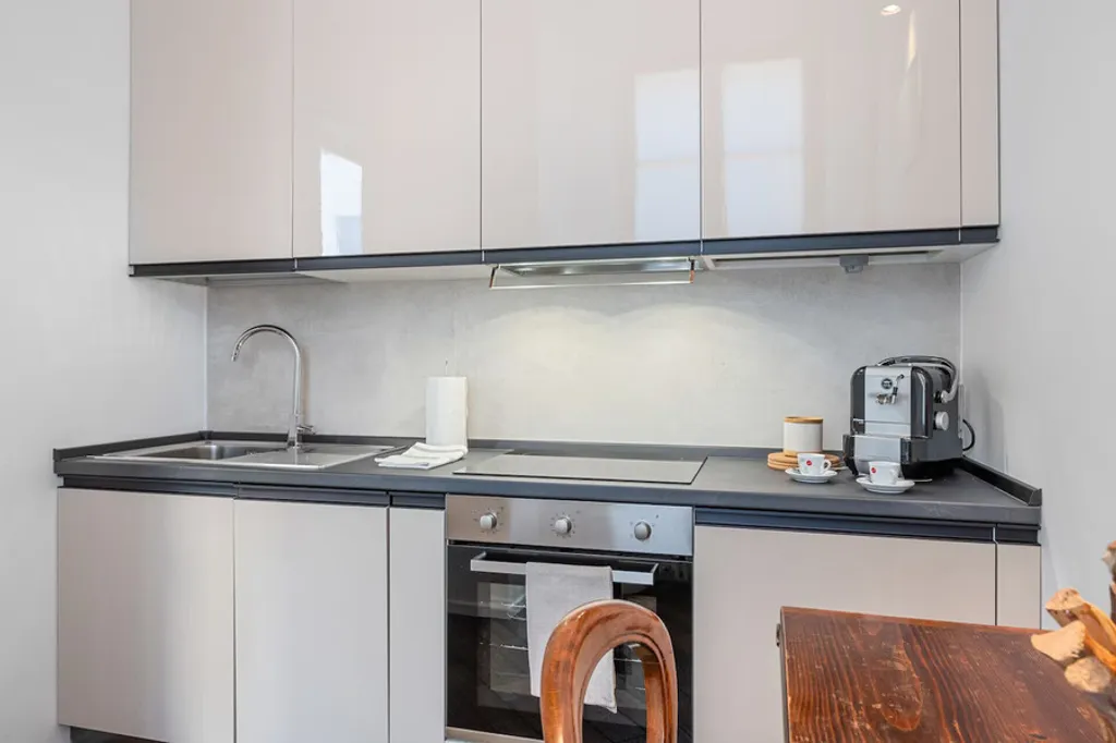 CUCINA con piano cottura a induzione, frigorifero, freezer, lavastoviglie, bollitore, forno.