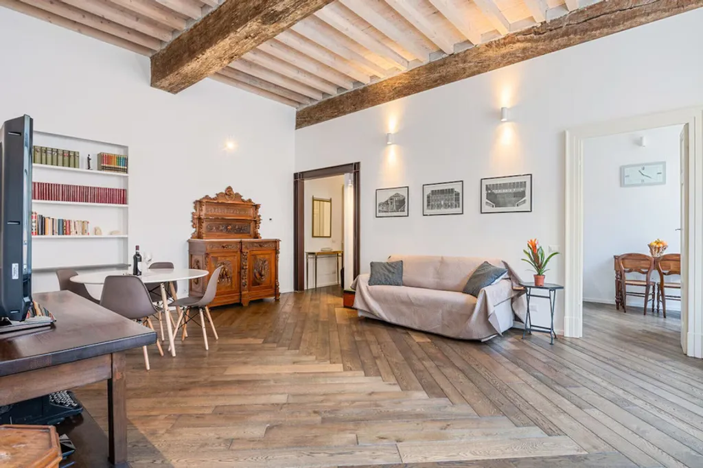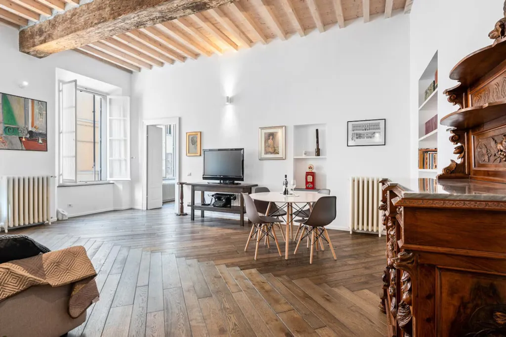 Ampio e tranquillo appartamento di 80 mq, situato al primo piano di un palazzo storico senza ascensore. La proprietà si trova nel cuore del centro storico di Parma.