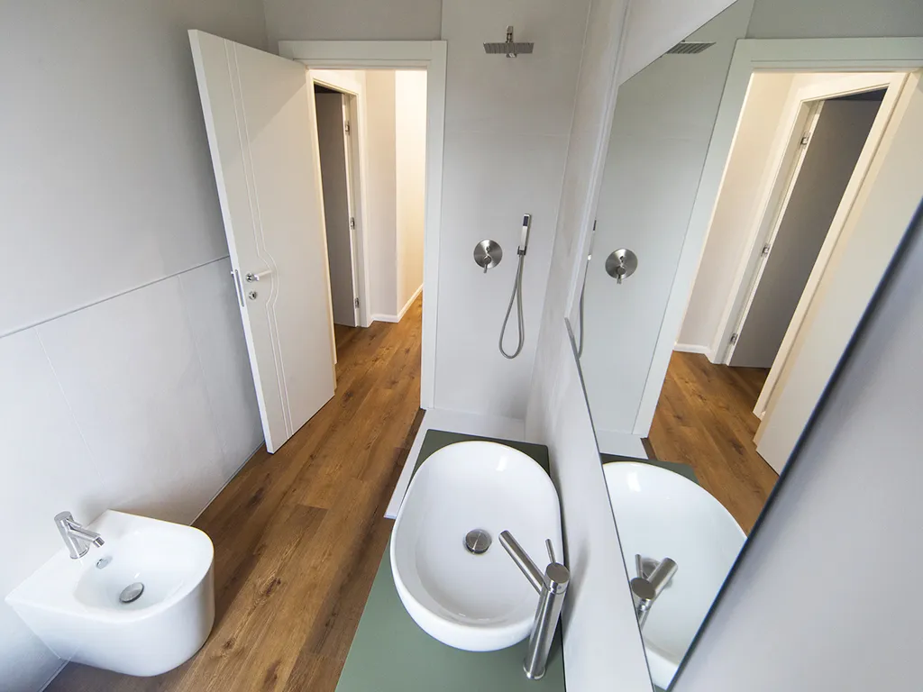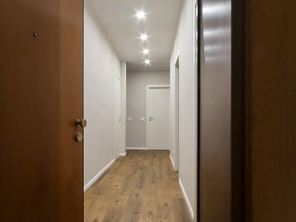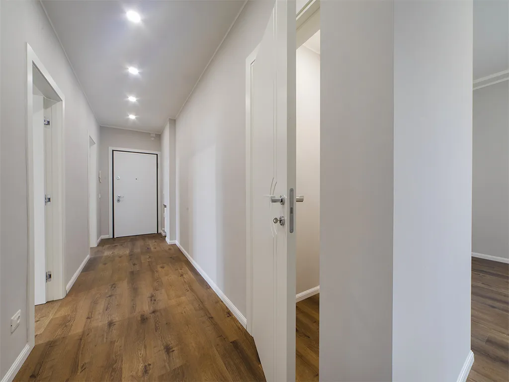 Alcune finiture: serramenti in pvc con vetrocamera e vasistas, portoncino blindato, pavimento effetto legno, sanitari filo muro, porte laccate color bianco, predisposizione per climatizzazione con 3 split, controsoffitto in cartongesso con faretti a led.