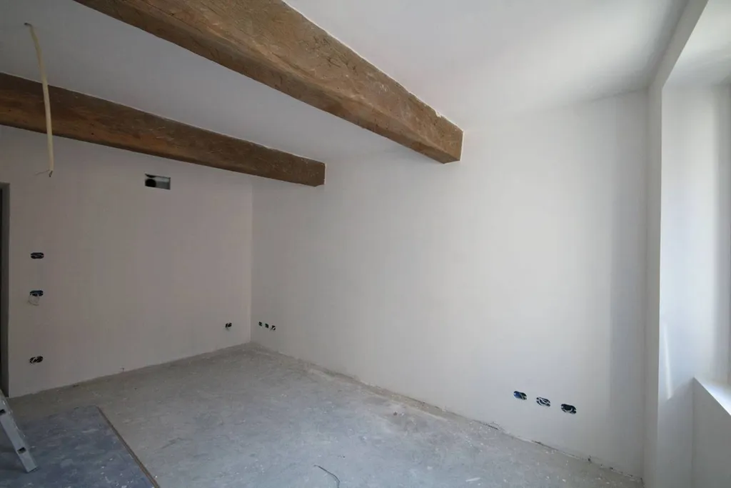 Il balcone affacciato sul borgo, le vecchie travature lignee a vista, il pavimento di Iroko spazzolato a listoni, le grandi porte finestre laccate, valorizzano ed illuminano gli ambienti, rendondoli eleganti ed esclusivi.