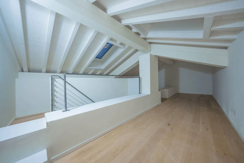 La zona soppalcata di 34 mq., si presenta come un raffinato open space, perfetto come studio, area hobby o spazio polifunzionale.