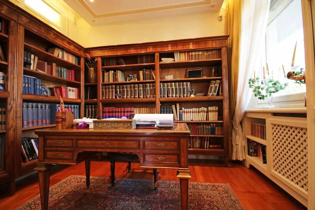 La porta delloffice scorre a delineare un piccolo mondo allinterno di uno più grande: un ambiente intimo e raccolto, abbracciato dai volumi custoditi dalla libreria in legno e attraversato dalla luce che filtra discreta dallampia finestra.