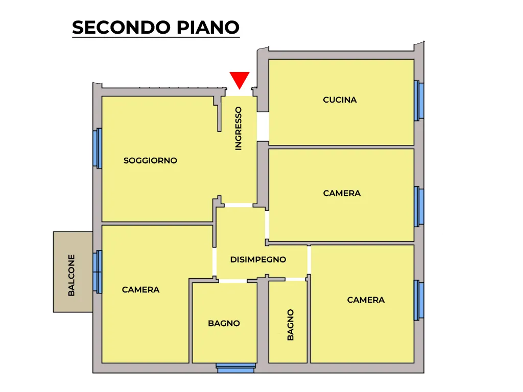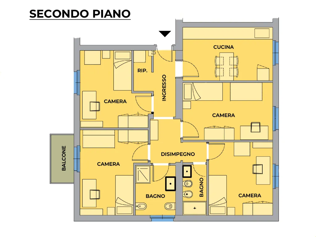 L’immobile è composto da ingresso, soggiorno, cucina abitabile dotata di elettrodomestici nuovi, tre camere, balcone, due bagni e ripostiglio.