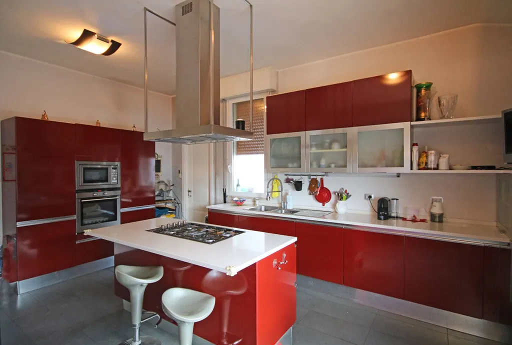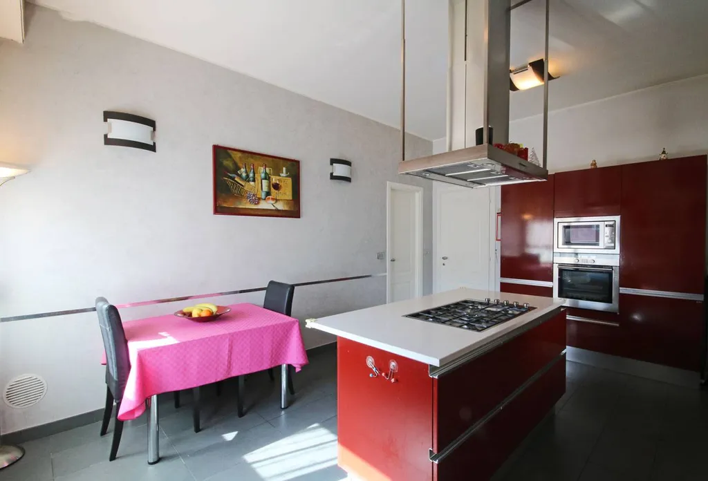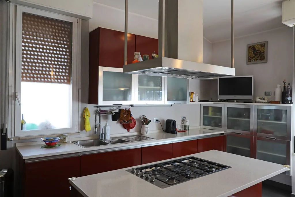 Dalla sala si apre un varco verso una cucina moderna, ampia e luminosa, dove due grandi finestre lasciano entrare la luce del giorno come un abbraccio, avvolgendo lambiente in unatmosfera calda, accogliente e piena di vita.