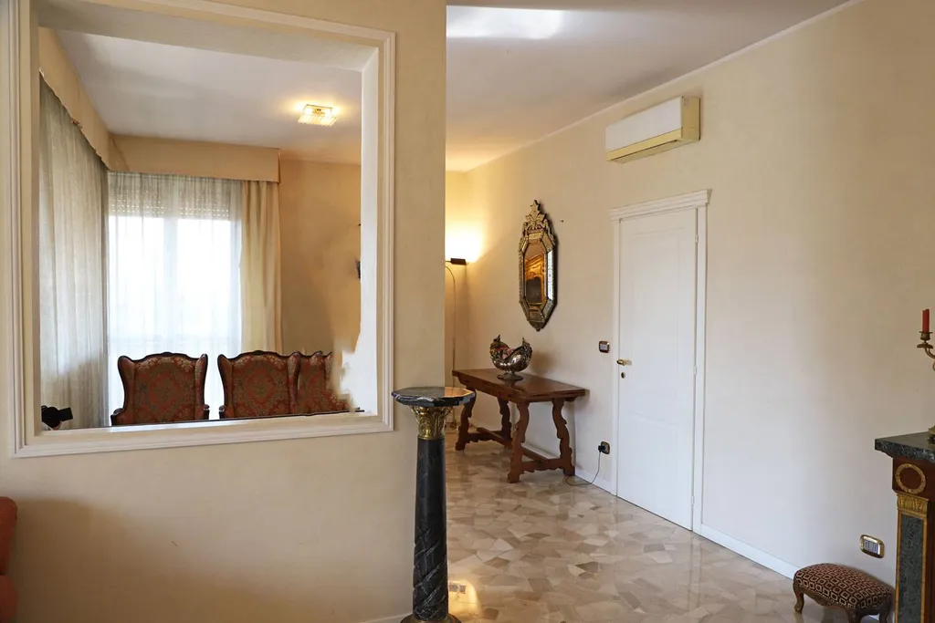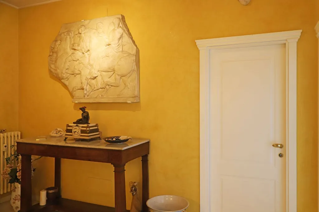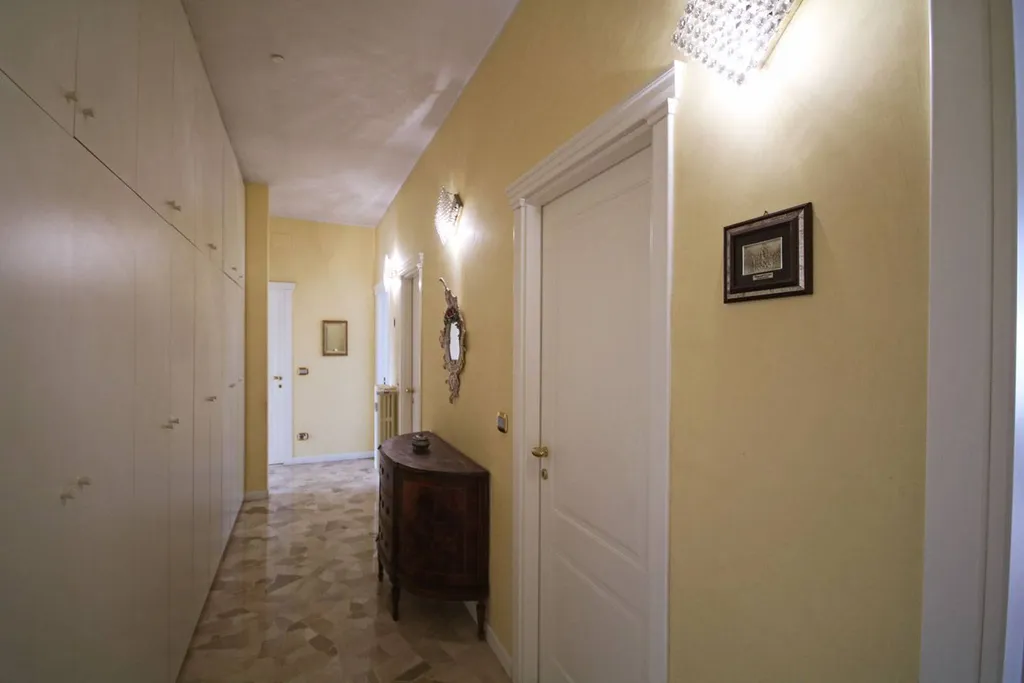 Varcata la soglia, si accede a un ampio ingresso che accoglie con uneleganza sobria e raffinata, esaltata dal contrasto armonioso tra le porte bianche dal design ricercato e le tonalità calde delle pareti.