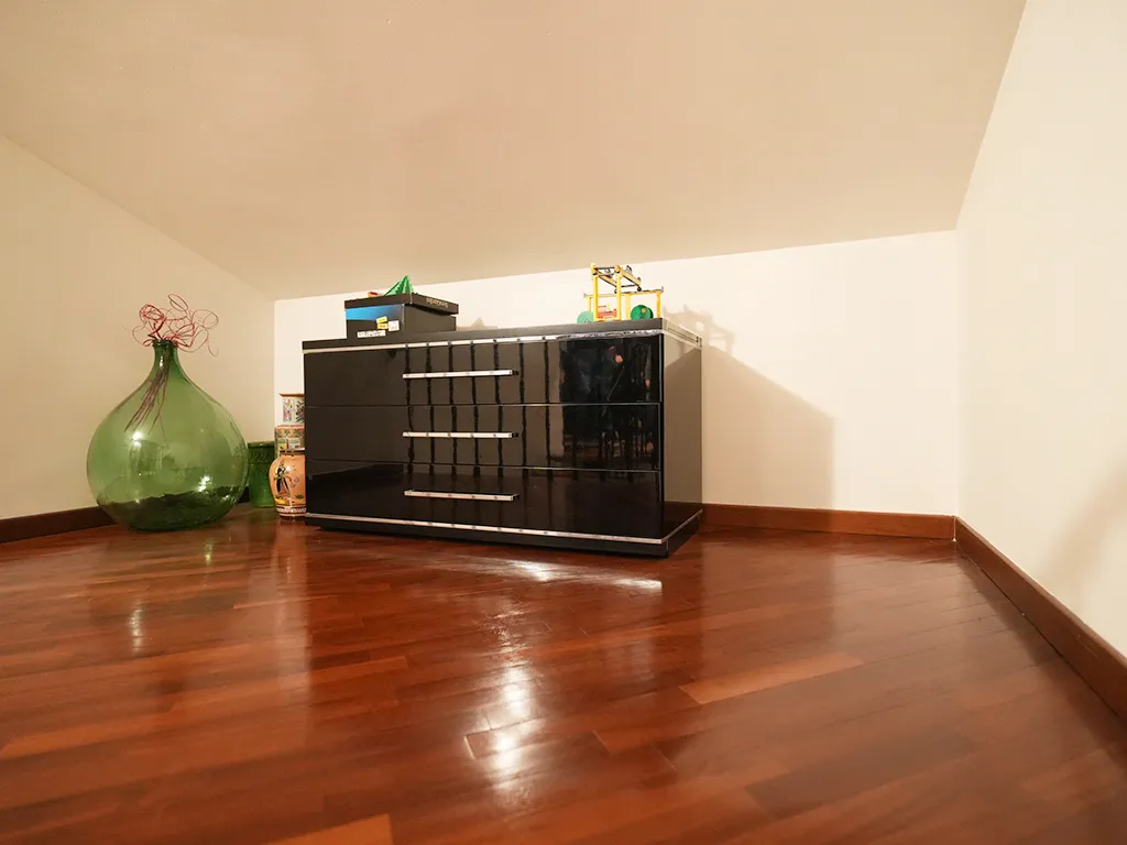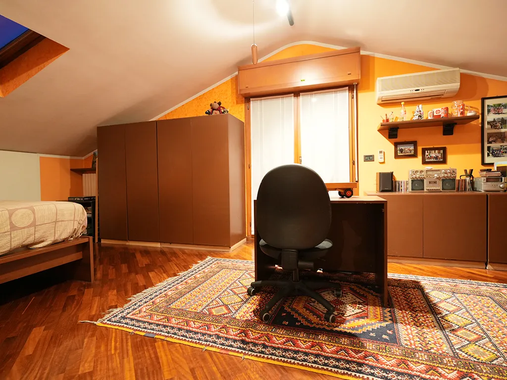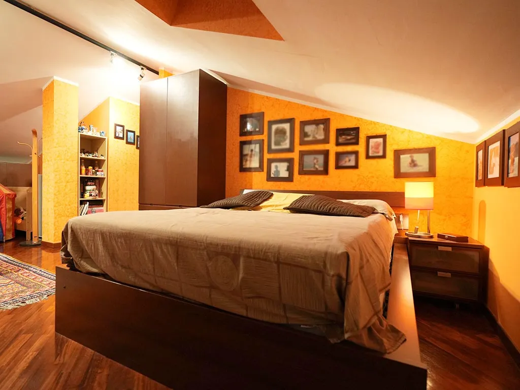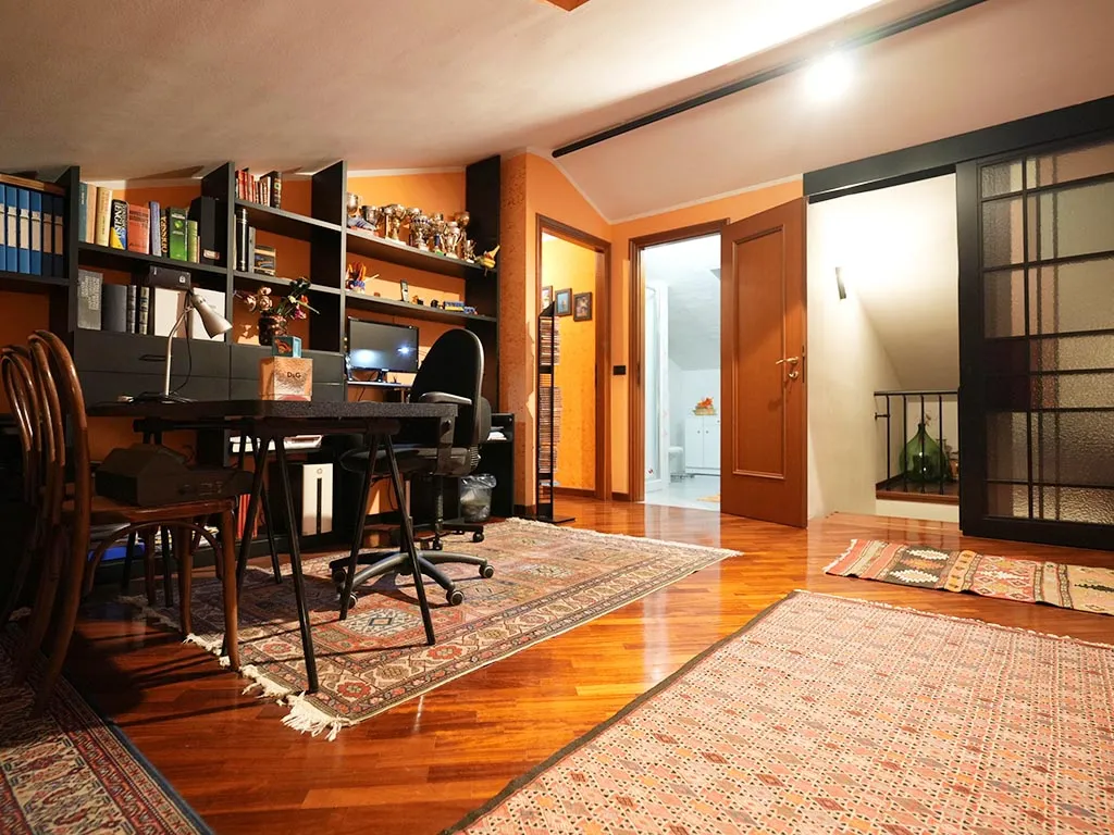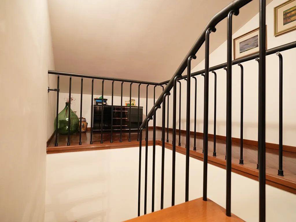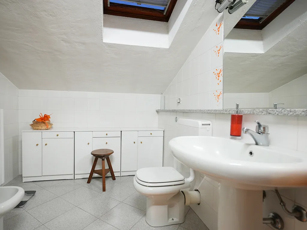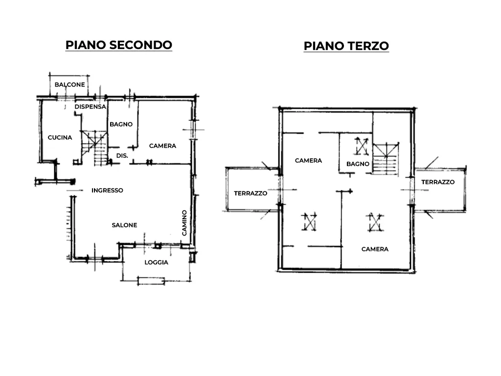 Così disposto: salone con camino, cucina con dispensa, camera matrimoniale, bagno e ripostiglio al piano secondo mentre al piano mansarda troviamo le due camere, altro servizio e due ampi terrazzi.