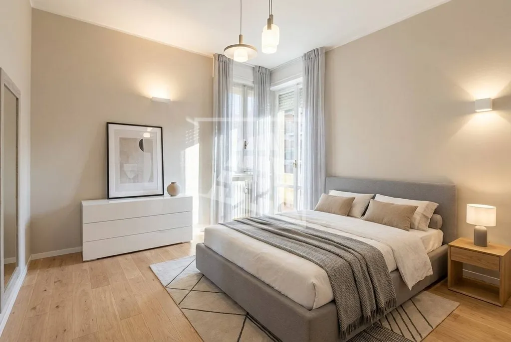 La zona notte, separata tramite disimpegno, è composta da tre camere da letto, servite da un ulteriore balcone e da due bagni entrambi finestrati, di cui uno dotato di box doccia e l'altro completo di attacchi per lavatrice.