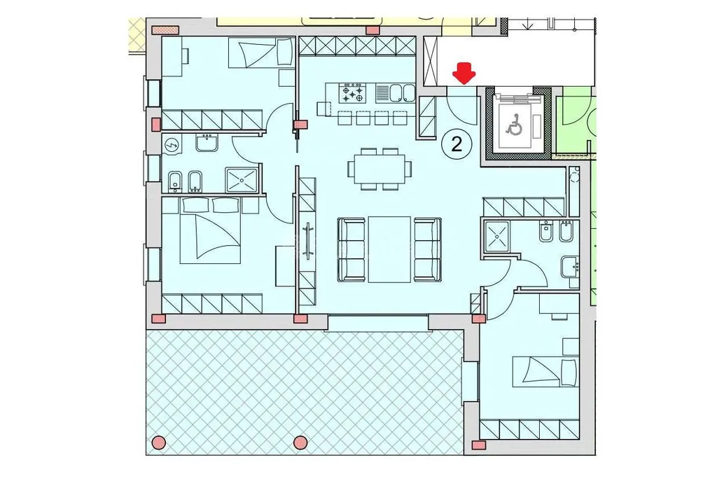L'appartamento, raggiungibile con ascensore, è composto da ingresso, un ripostiglio/guardaroba con possibilità di adibirlo a lavanderia, soggiorno con affaccio su ampia loggia di 36 mq, cucina a vista, primo disimpegno che conduce alla zona notte che comprende una camera da letto matrimoniale, una camera singola, bagno finestrato e secondo disimpegno che consente l'accesso alla terza camera da letto singola e al secondo bagno.