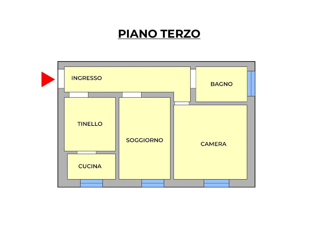 La proprietà di circa m² 62 si compone da soggiorno, tinello, cucinotto, camera e bagno.
