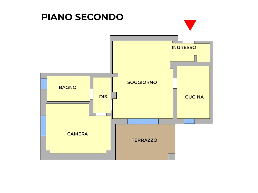 La proprietà si compone di ingresso, soggiorno con accesso al terrazzo, cucina abitabile, camera matrimoniale, disimpegno, camera matrimoniale, bagno con finestra e ripostiglio.