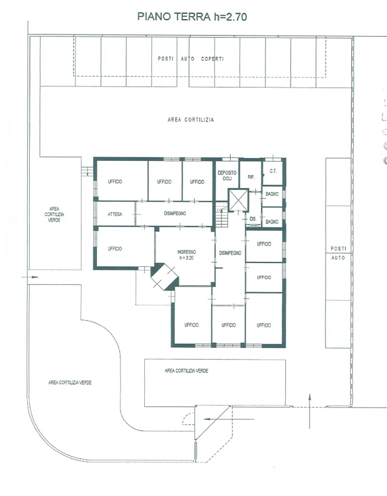 La palazzina interamente recintata sui 4 lati si sviluppa su 3 piani servita da ascensore, di 300 mq a piano per un totale di 900 mq dove all’interno e stata suddivisa da divisori in cartongesso e facilmente removibili, ricavando 10 uffici e 2 servizi a ogni piano, in oltre 15 posti auto all’interno dell’area cortiliva con accesso tramite portone carraio automatizzato.