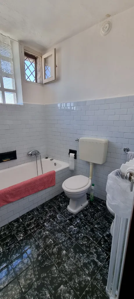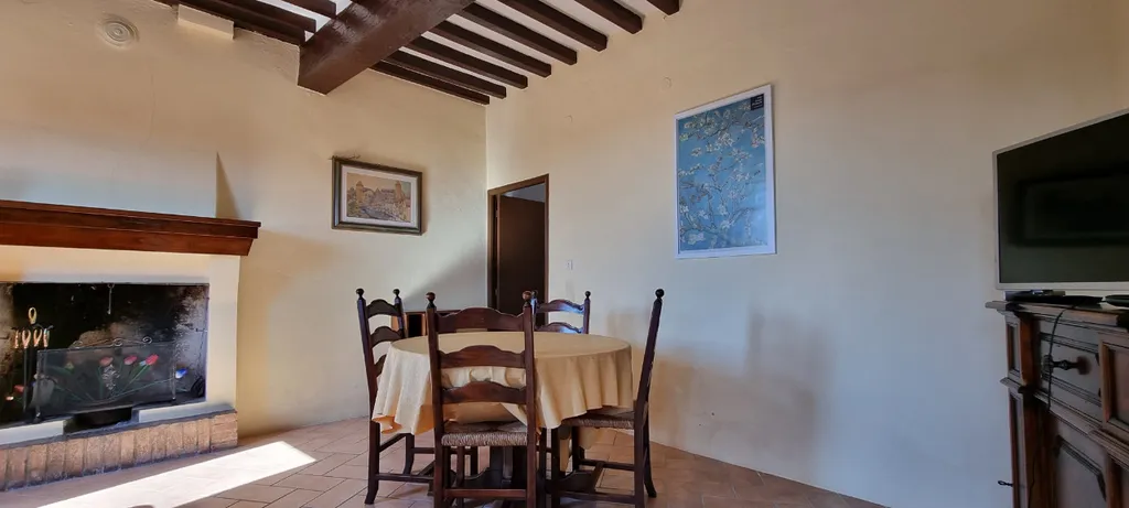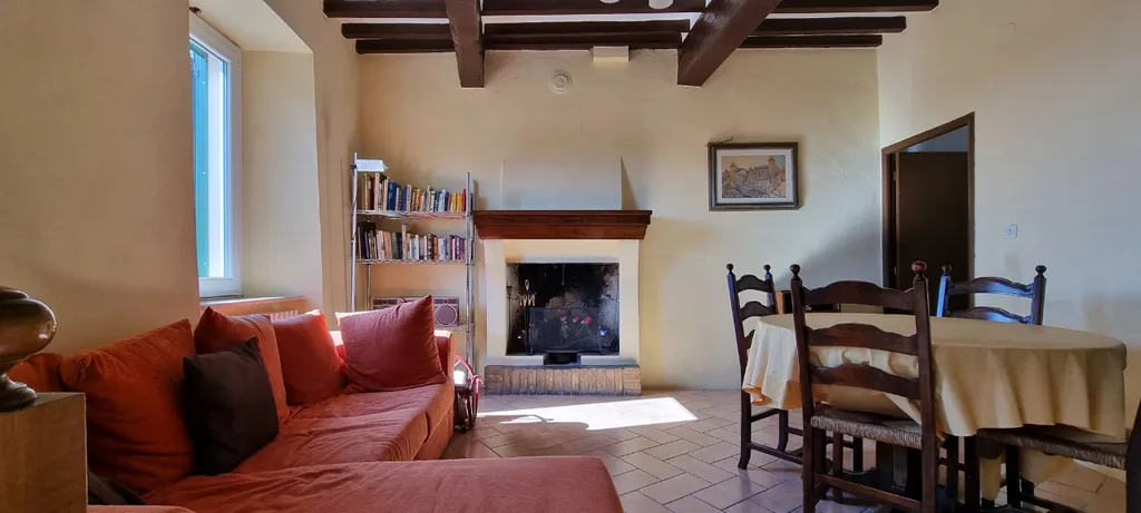 Camino funzionante a legna. Infissi nuovi in PVC di colore bianco con ante ribaltabili a vasistas.