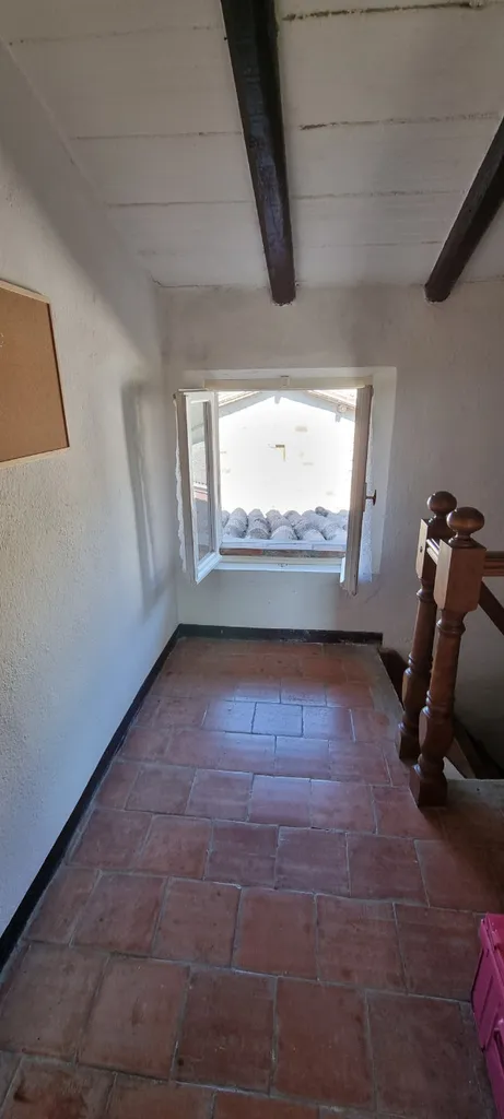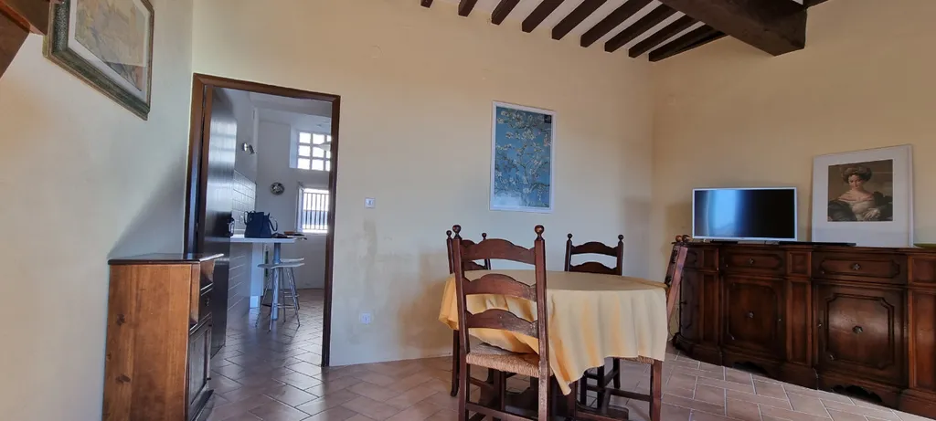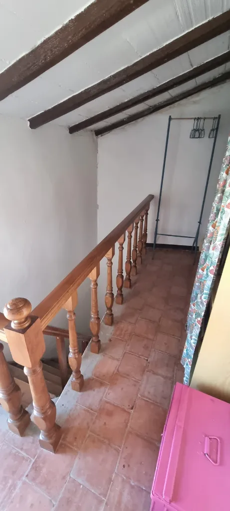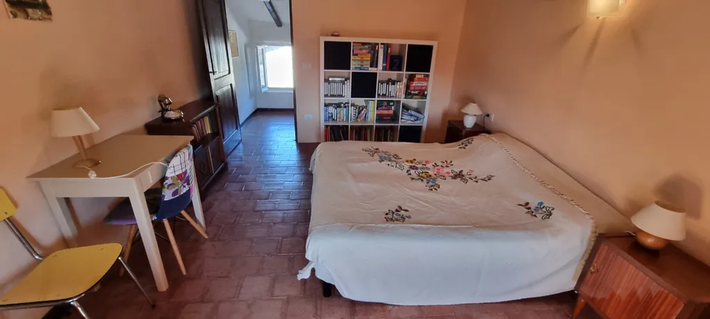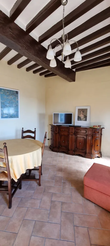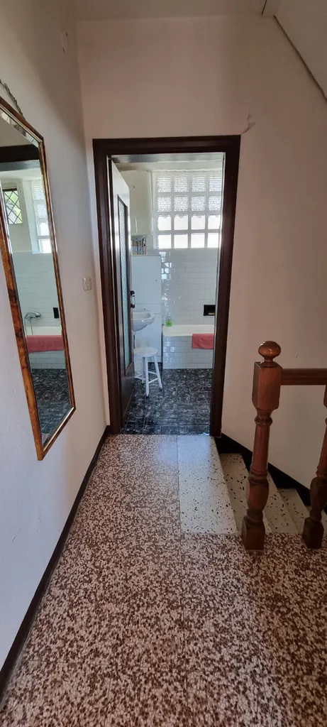 Particolari di travi in legno a vista. La pavimentazione è per la totalità in monocottura tranne ceramica nel servizio.
