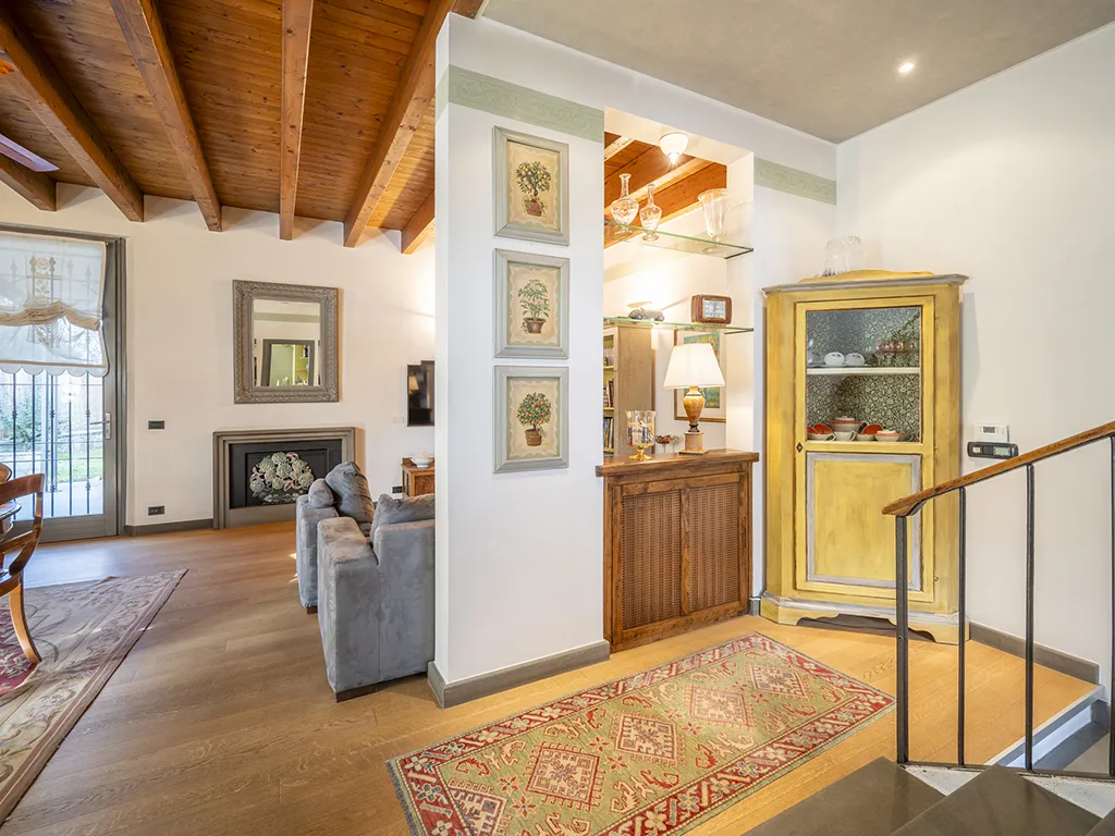 Al piano terra troviamo accogliente zona giorno con pavimenti in legno e travi e travetti in legno composta da soggiorno con accesso diretto sul giardino e una cucina separata.