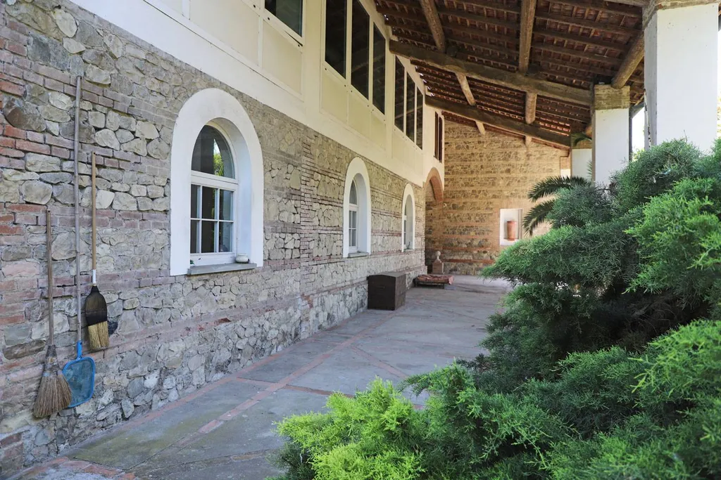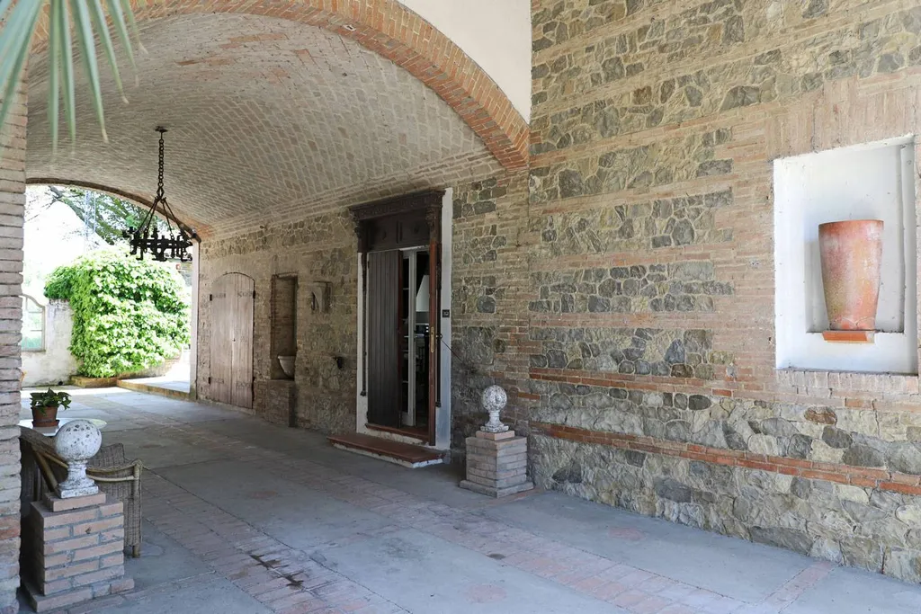 La torretta bianca spicca sul tetto tra i colori della muratura sottostante in pietra listata. Due ampi porticati esterni, ai lati opposti, assicurano zone di benessere che incorniciano il panorama come unopera darte.