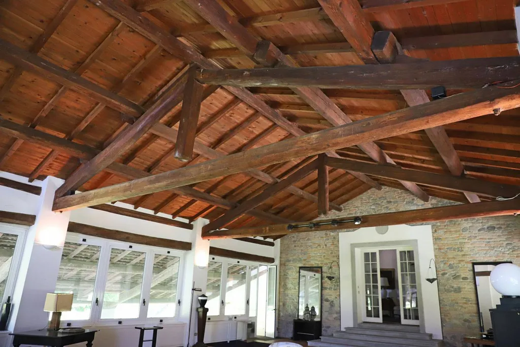 Lex fienile regala una scenografica perfezione di equilibri in un gioco di rimandi tra il legno al pavimento e al soffitto sostenuto dallimponente capriata, e il colore chiaro alle pareti amplificato dalle numerose aperture di luce sullesterno. Lambiente dallampio respiro coniuga lospitalità del volume allintimità del pensiero creativo.