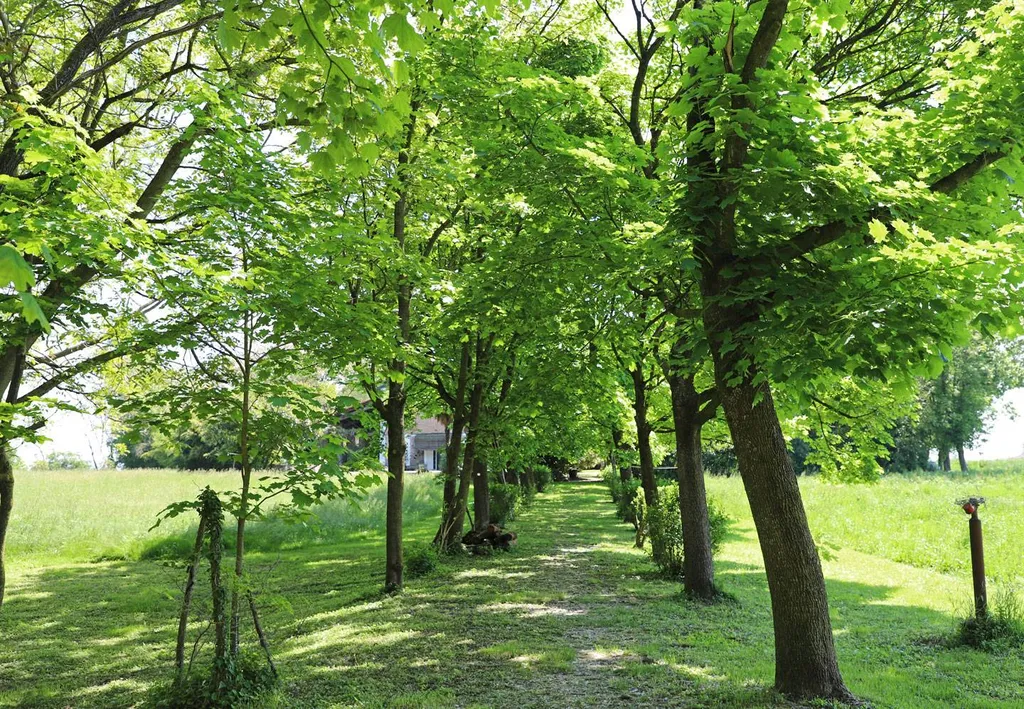 I porticati aperti sulla piscina inviatano verso un viale alberato che entra nel parco del Taro.