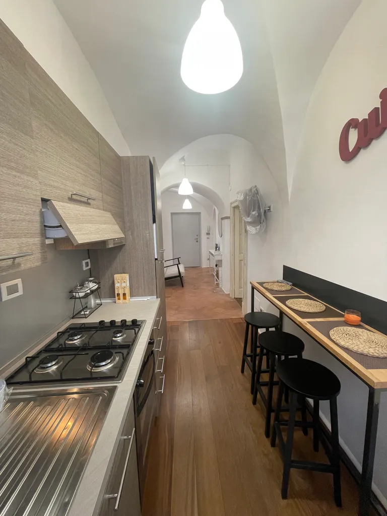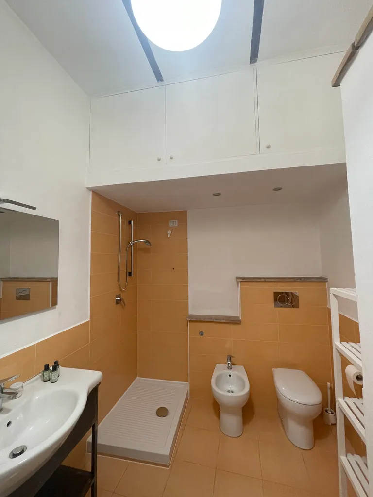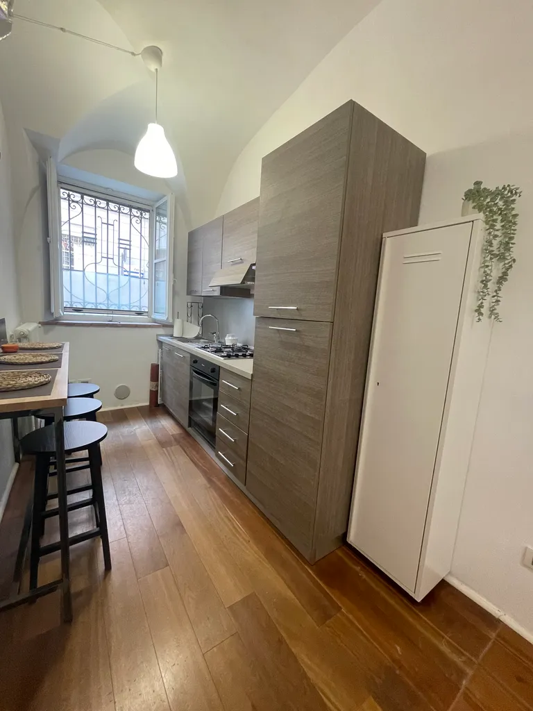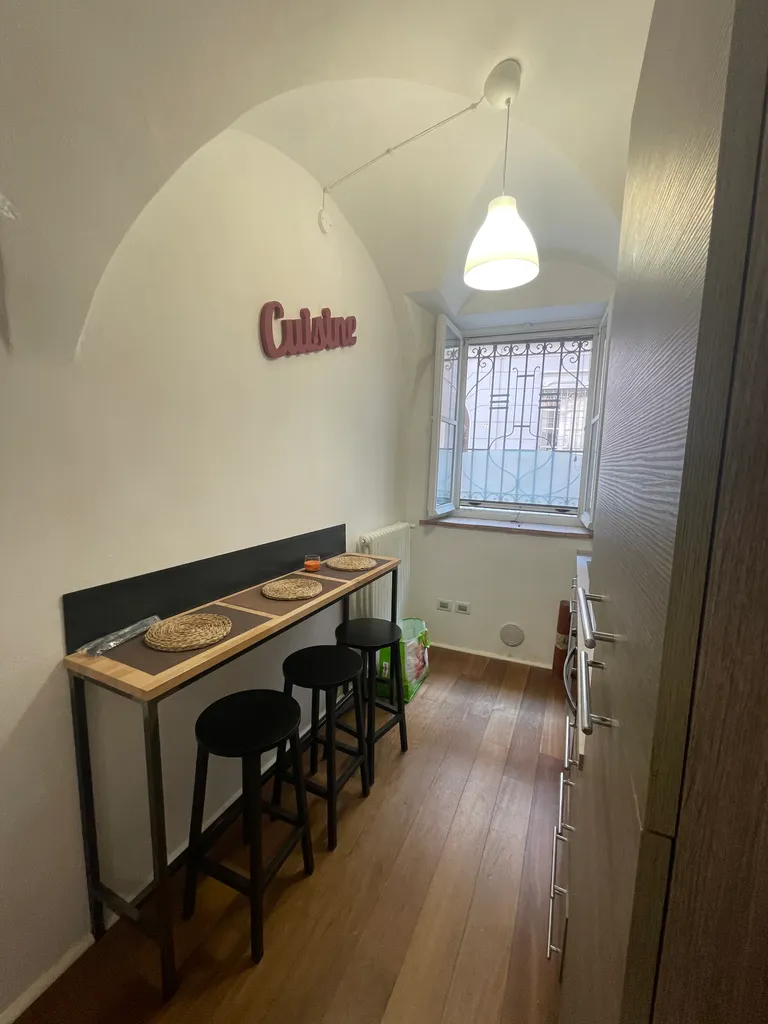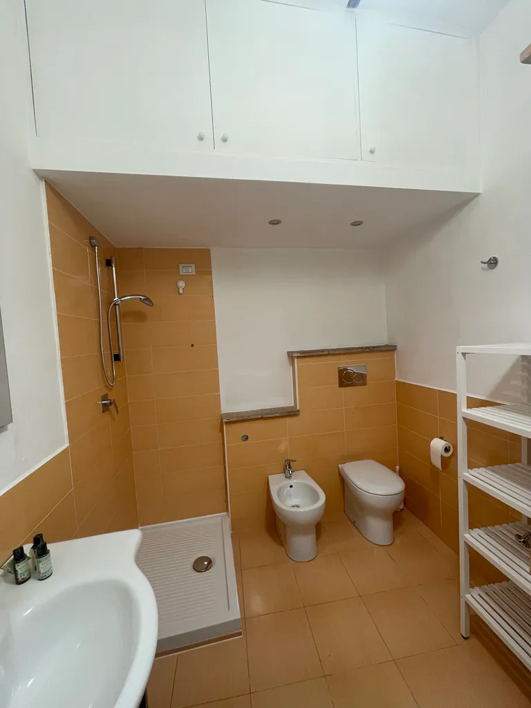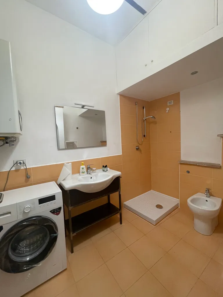 La cucina è ben attrezzata (anche di vettovaglie) e il bagno (che ha la finestra) contiene la lavatrice, box doccia ed ampia armadiatura ad uso ripostiglio.