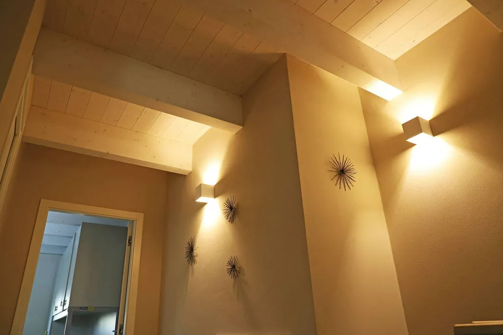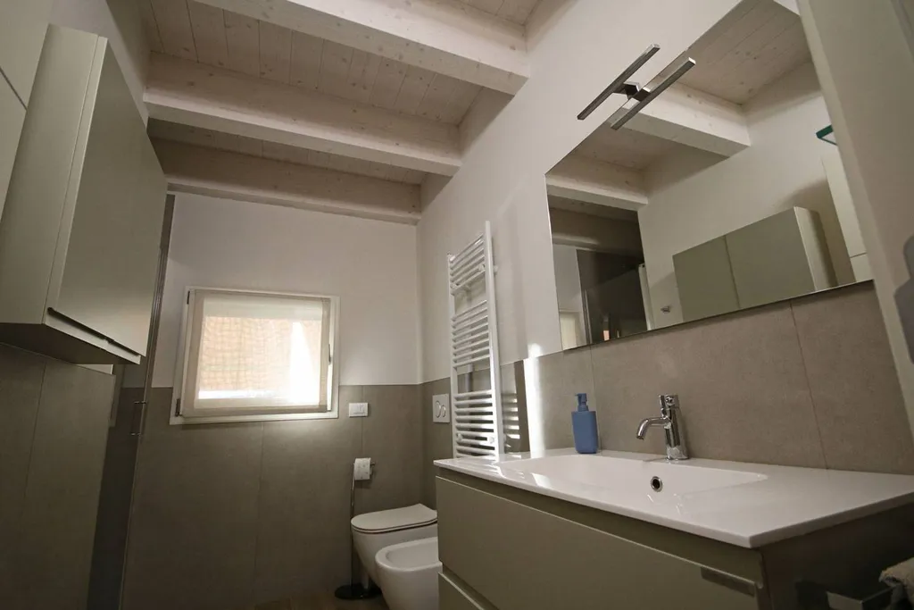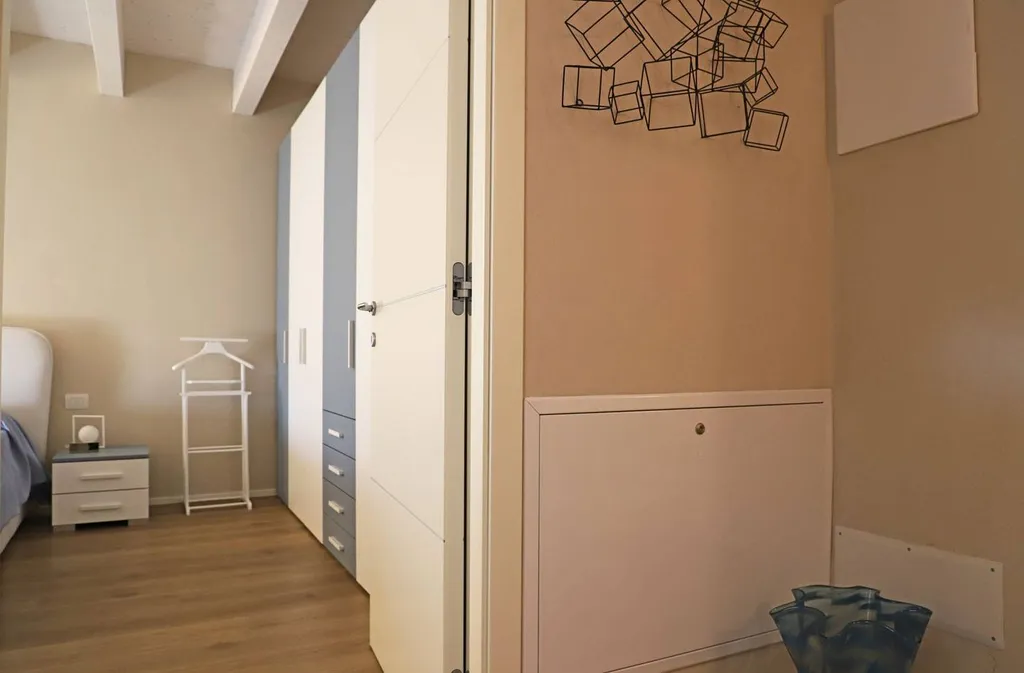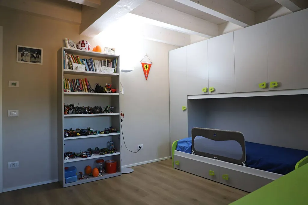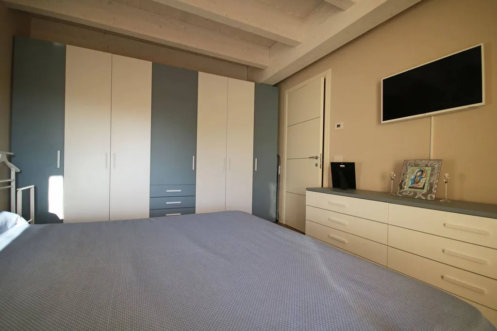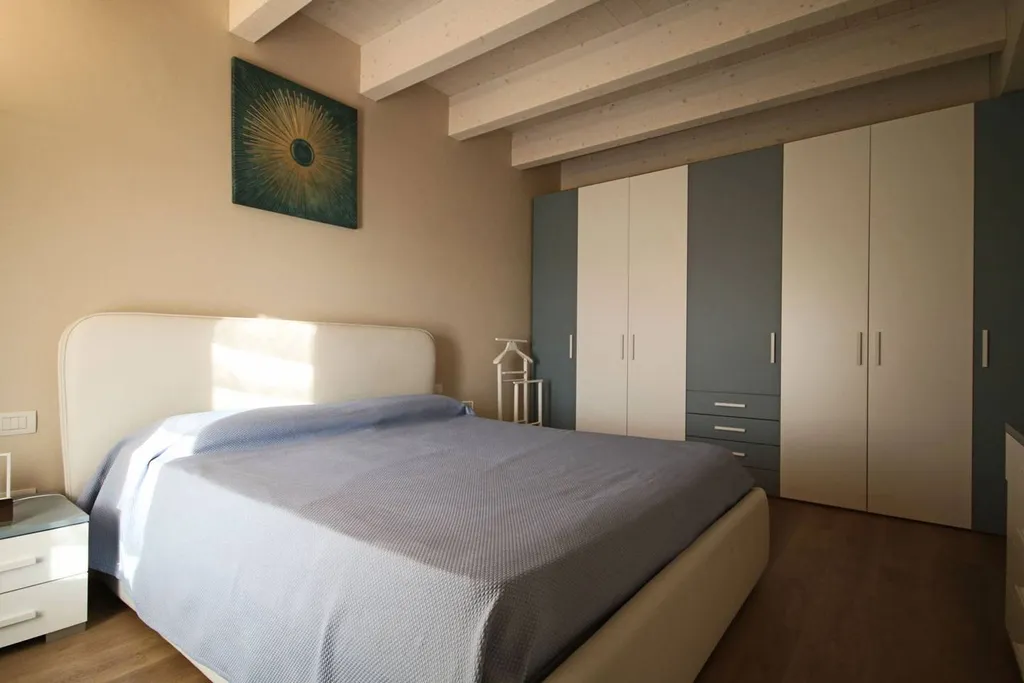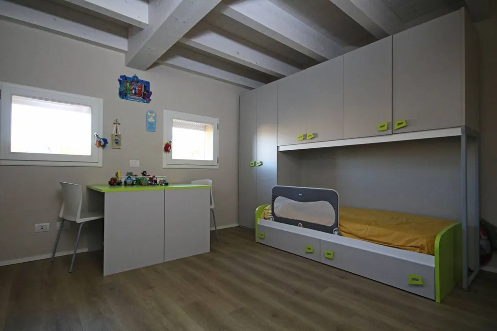 Nella zona notte, i soffitti in legno con travetti a vista donano unatmosfera calda e raffinata, arricchendo ulteriormente leleganza degli ambienti.