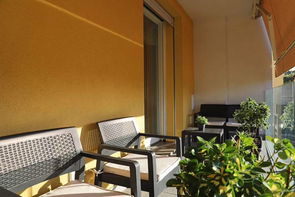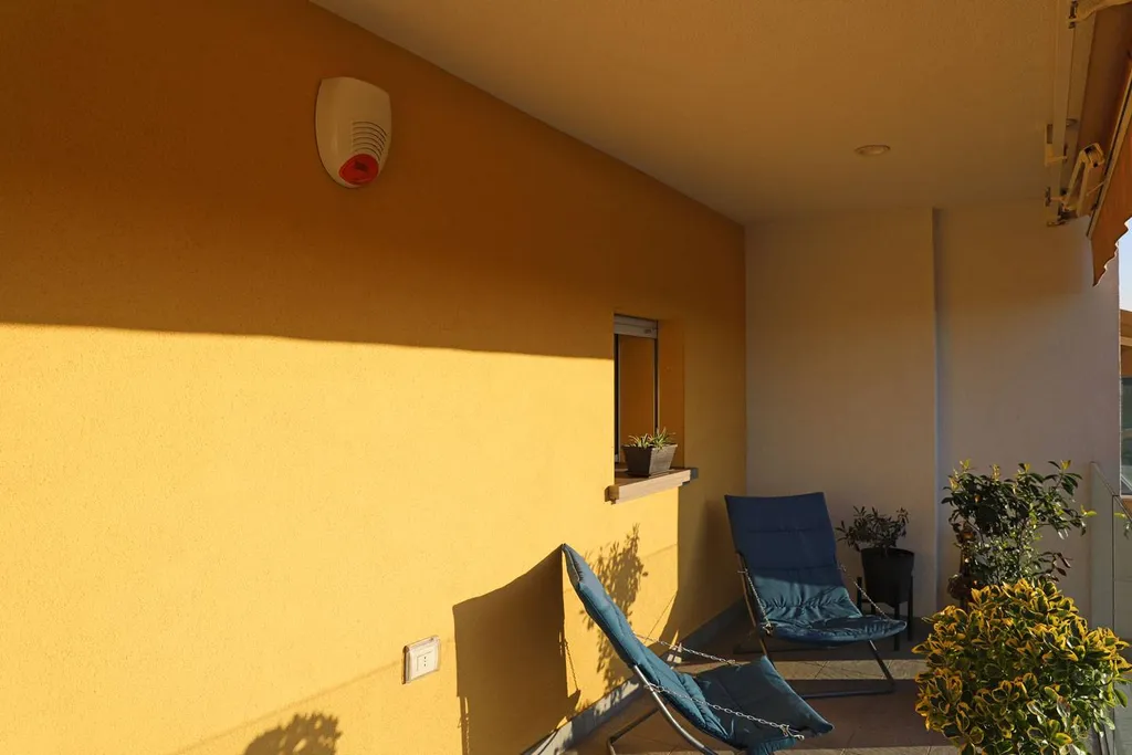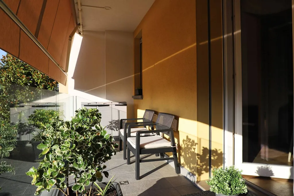 Gli ampi serramenti scorrevoli in vetro inondano di luce naturale la zona living, creando una continuità armoniosa tra interno ed esterno. I loggiati, rifiniti con parapetti in cristallo e dotati di tendoni da sole, amplificano la vivibilità degli spazi allaperto, perfetti per rilassarsi o ricevere ospiti in ogni stagione.