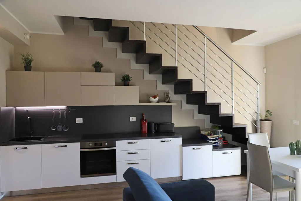 Un comodo disimpegno conduce al bagno finestrato, rifinito con gusto. Una scala a vista accompagna alla zona notte, posta al piano superiore (accatastata come sottotetto).