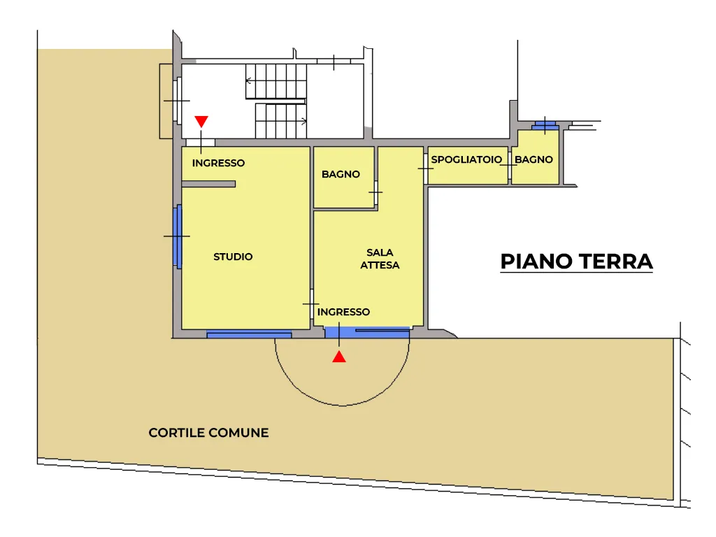È composto da: ingresso, sala d’attesa e sala adibita ad ambulatorio odontoiatrico, oltre a un bagno e a un ulteriore locale adibito a spogliatoio con secondo bagno.