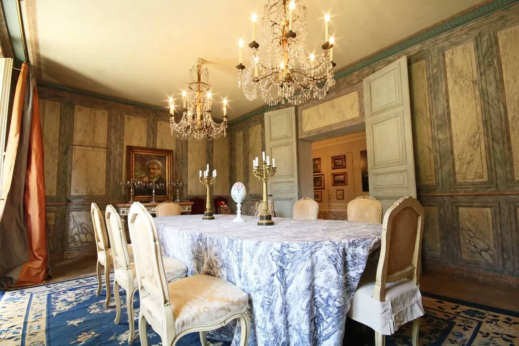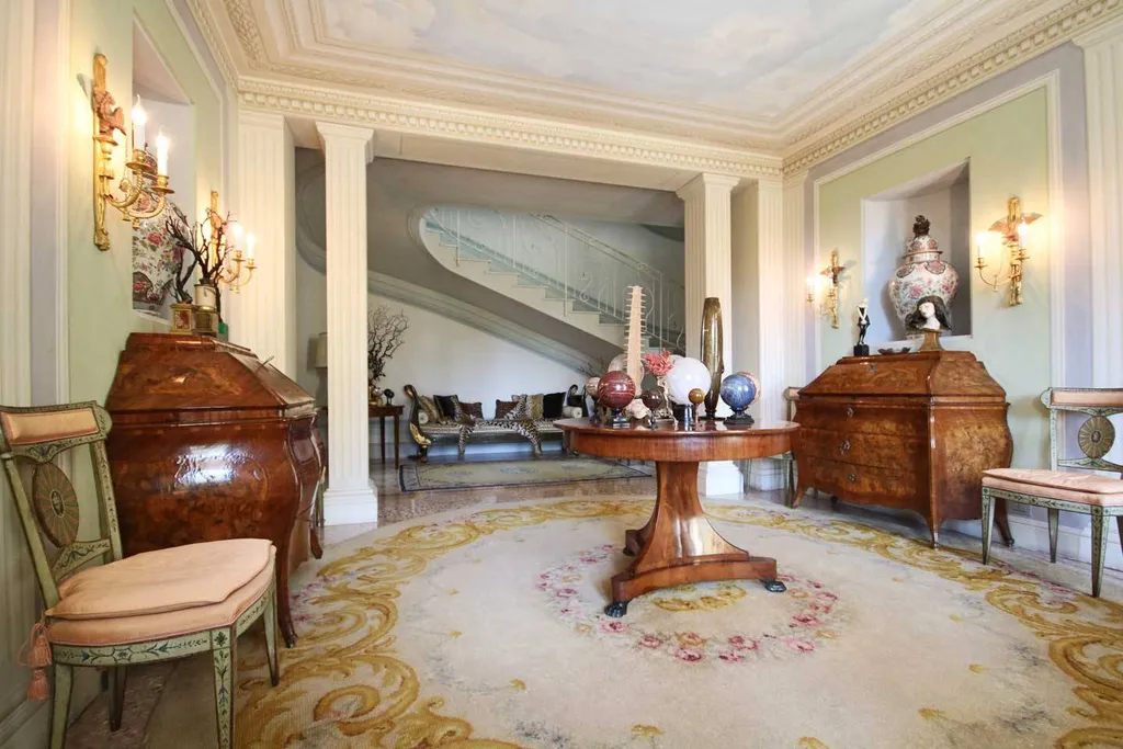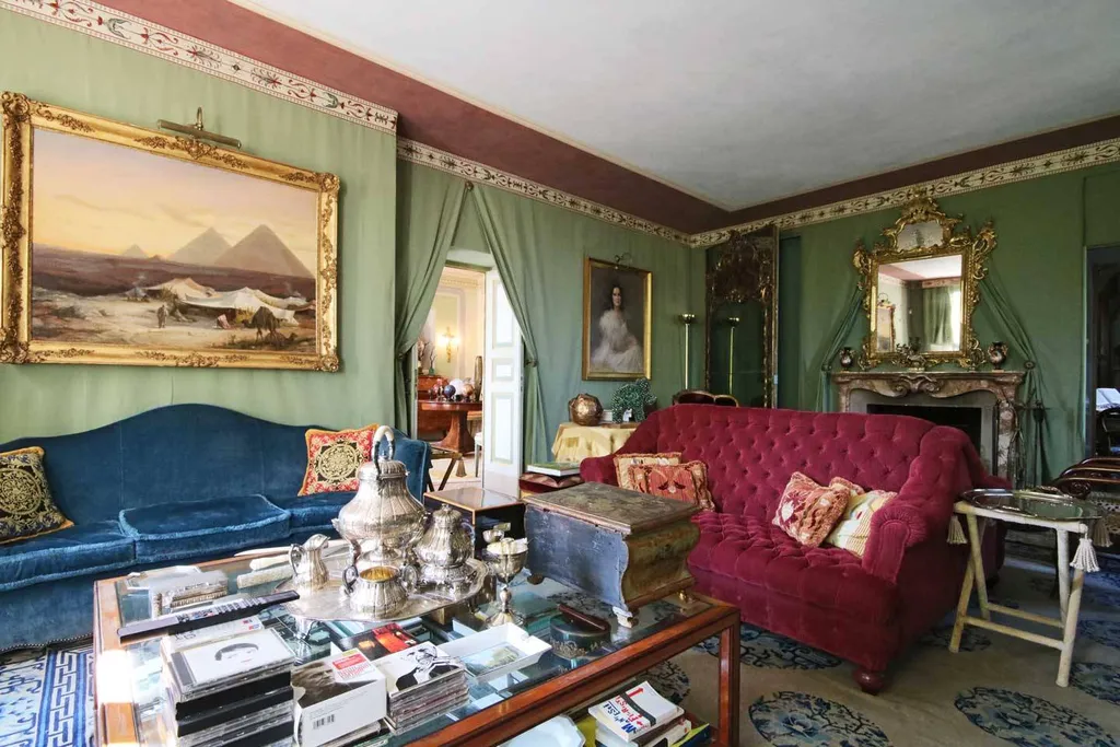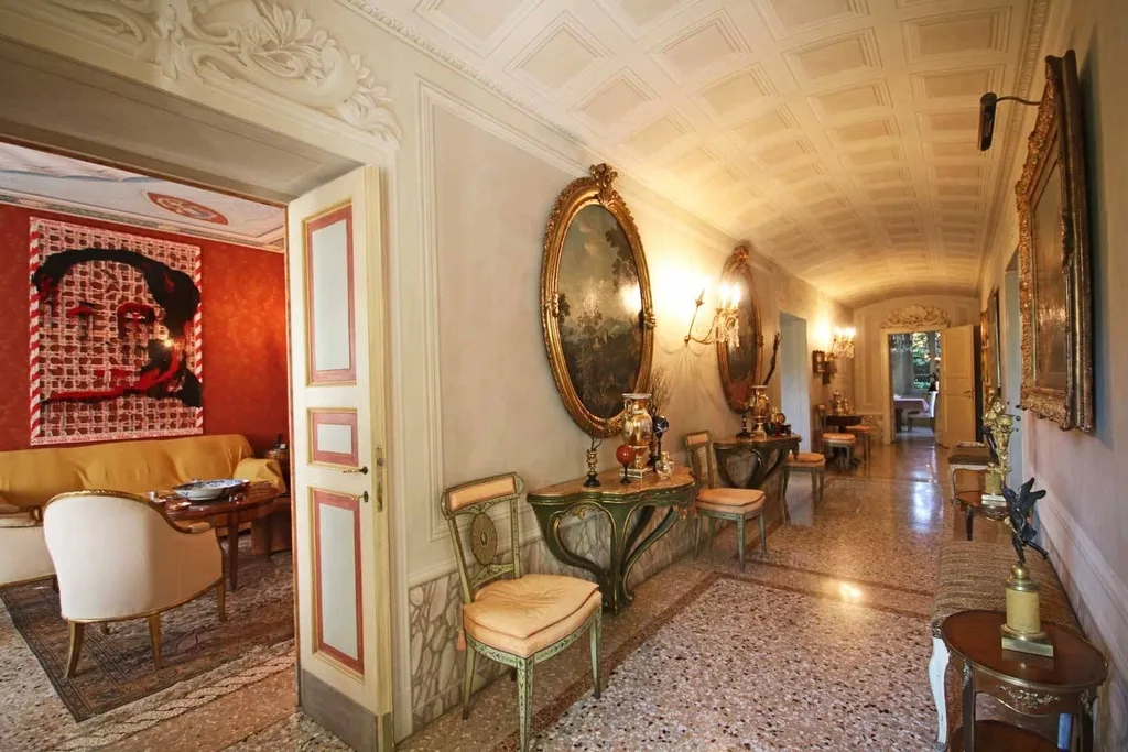 Il piano terreno, riservato allaccoglienza diurna, è percorso dai pavimenti in seminato veneziano, opera di artisti artigiani veneti appositamente impegnati nella composizione. Pareti e soffitti riportano garbati decori di sobria eleganza che dialogano con le scelte cromatiche settecentesche degli arredi. I rivestimenti delle stanze, opera del tappezziere del Quirinale, mostrano stoffe pregiate che delineano il carattere proprio di ogni ambiente. Camini antichi sormontati da specchiere dalle ampie e ricche cornici dorate, creano un contesto artistico nato da ricerca e passione scaturiti dal cuore: e solo ciò che nasce dal cuore può restituire emozioni vere come accade in questa dimora. Ogni oggetto narra la propria storia nella provenienza da contesti storici di pregio, come le porte a specchio dorate giunte da una villa siciliana, o la boiserie del 700 che abbraccia lintero perimetro della sala da pranzo dal pavimento al soffitto; proviene da un castello di Bordeaux e diffonde un gusto francese totalmente unico nella sua meravigliosa verità. I lampadari settecenteschi genovesi illuminano la toile de jouy che ammanta il grande tavolo posato sul caratteristico pavimento ligneo anchesso dal vissuto precedente in antiche dimore.