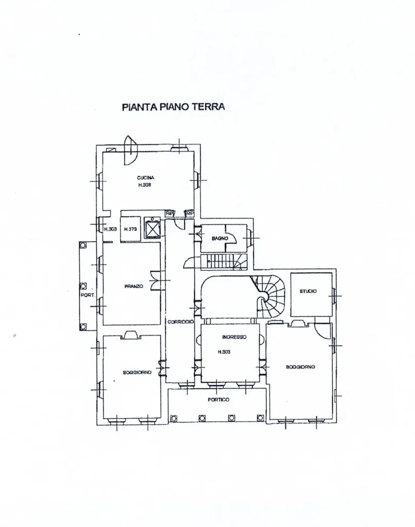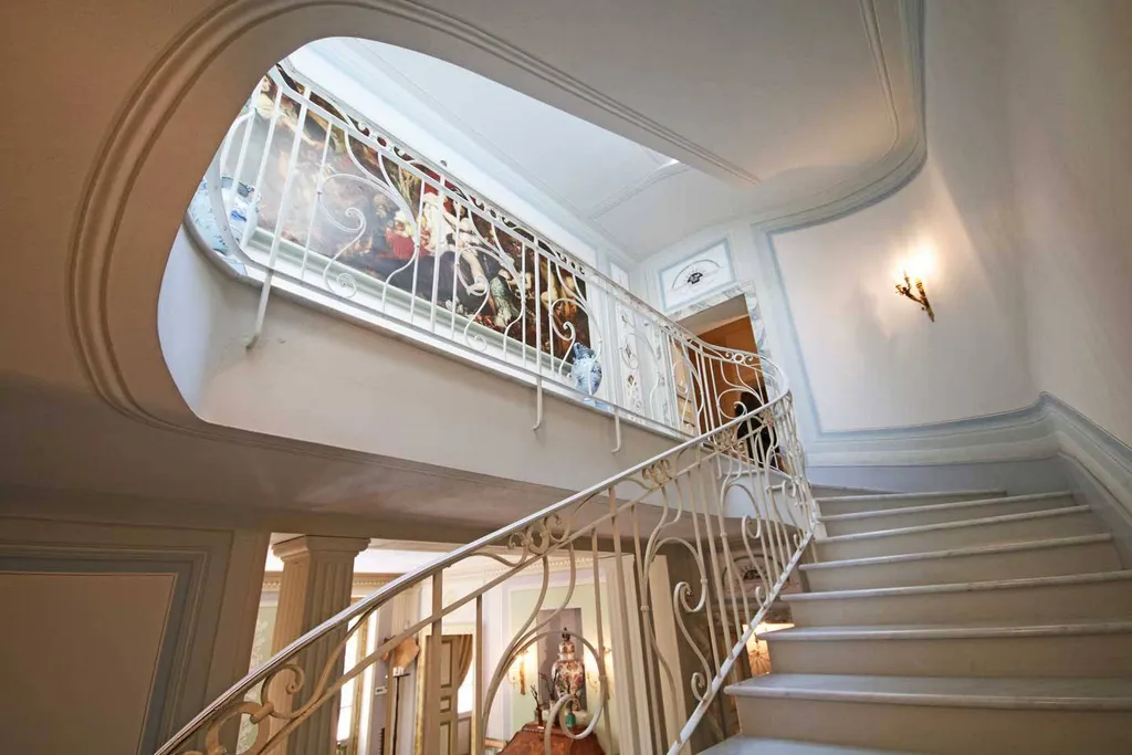 P.t.:ingresso di rappresentanza, doppia zona living affacciata sul parco, studio, grande cucina abitabile, sala da pranzo, bagno. L importante e scenico scalone centrale, rivestito in marmo bianco, collega i piani superiori, serviti anche di ascensore.