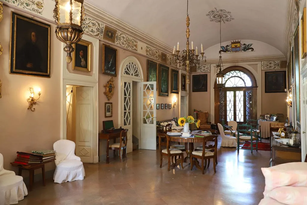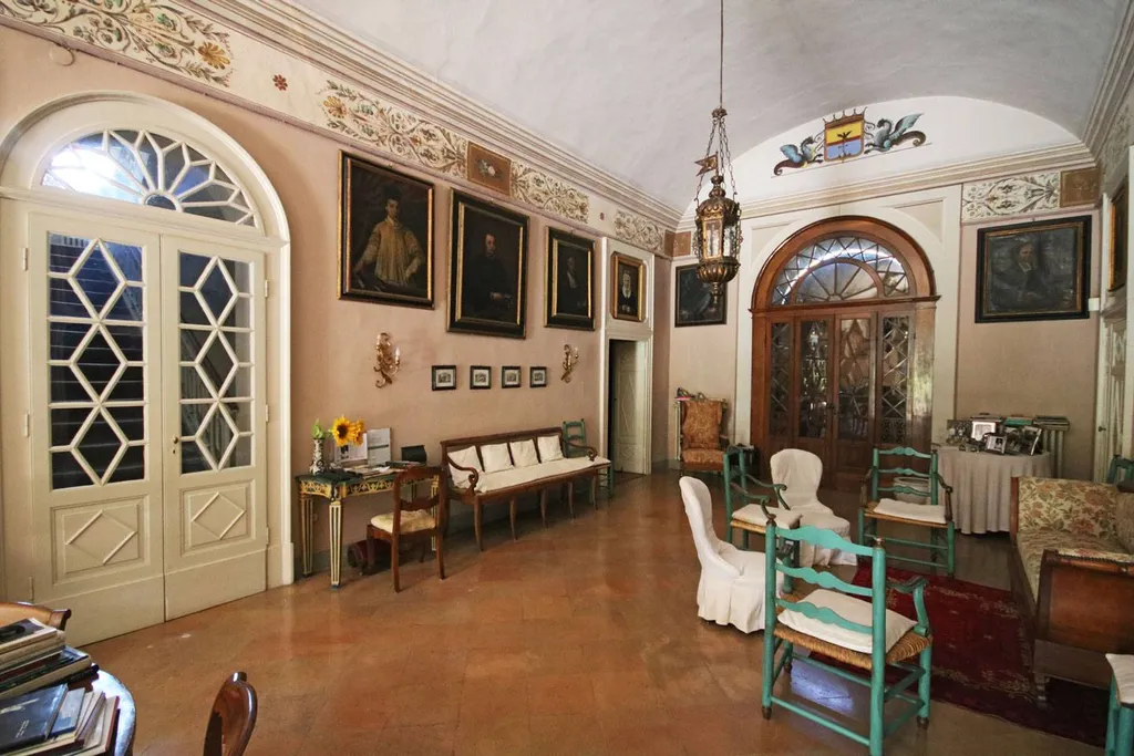 La residenza di tipica pianta tetragona edificata nei primi dell800 vanta il pregio di essere rimasta inalterata al suo interno presentando una rara originalità degli spazi ampi disegnati su uno stile di vita aristocratico di campagna. Il salone centrale voltato a botte e decorato con fascioni riporta lo stemma nobiliare sui due frontoni e richiama lo scenografico andito laterale con volta a padiglione analogamente decorato con fascia e costoloni.