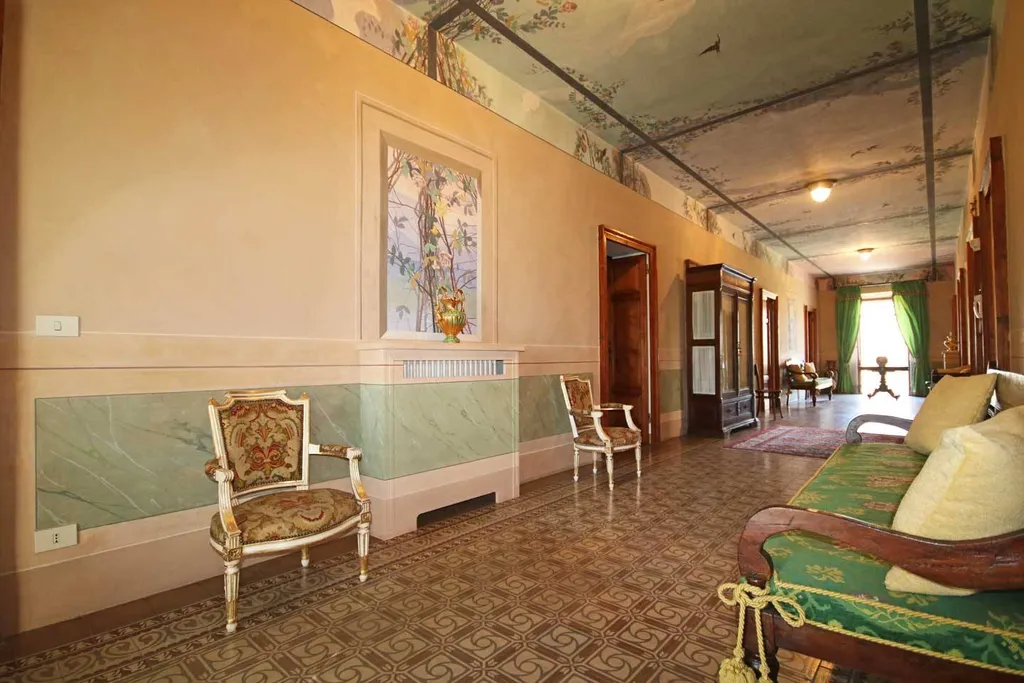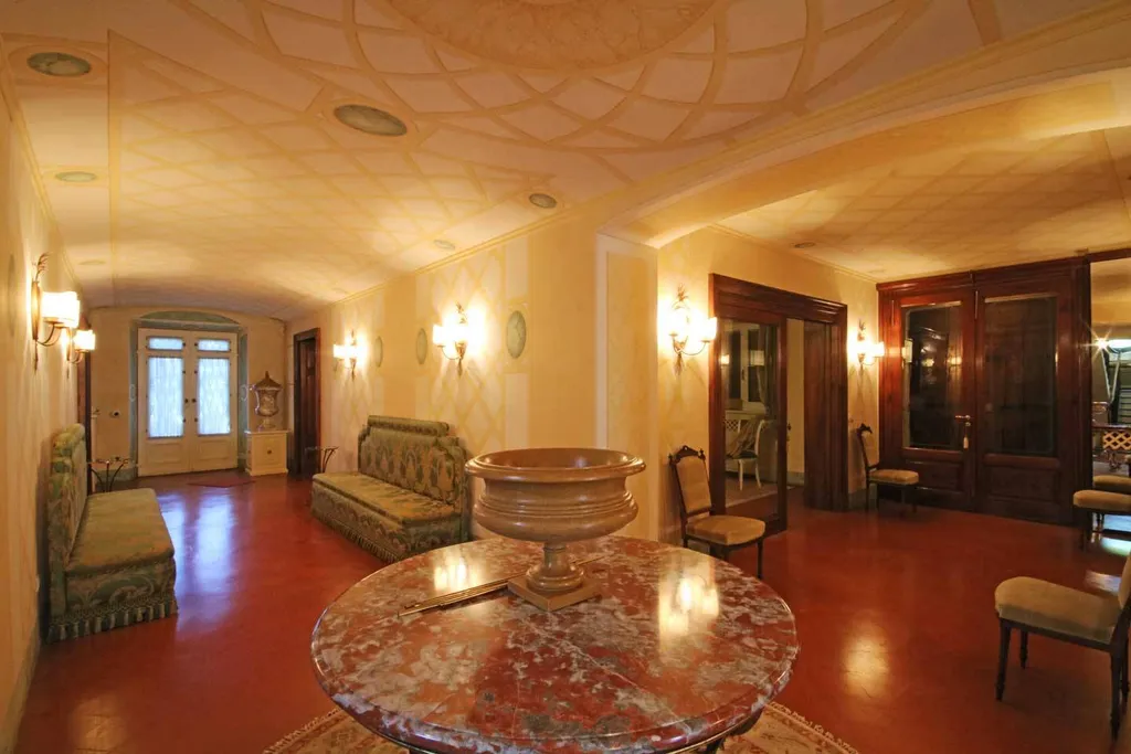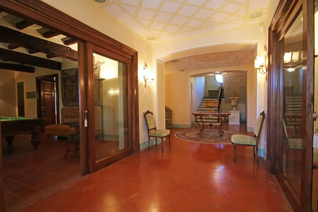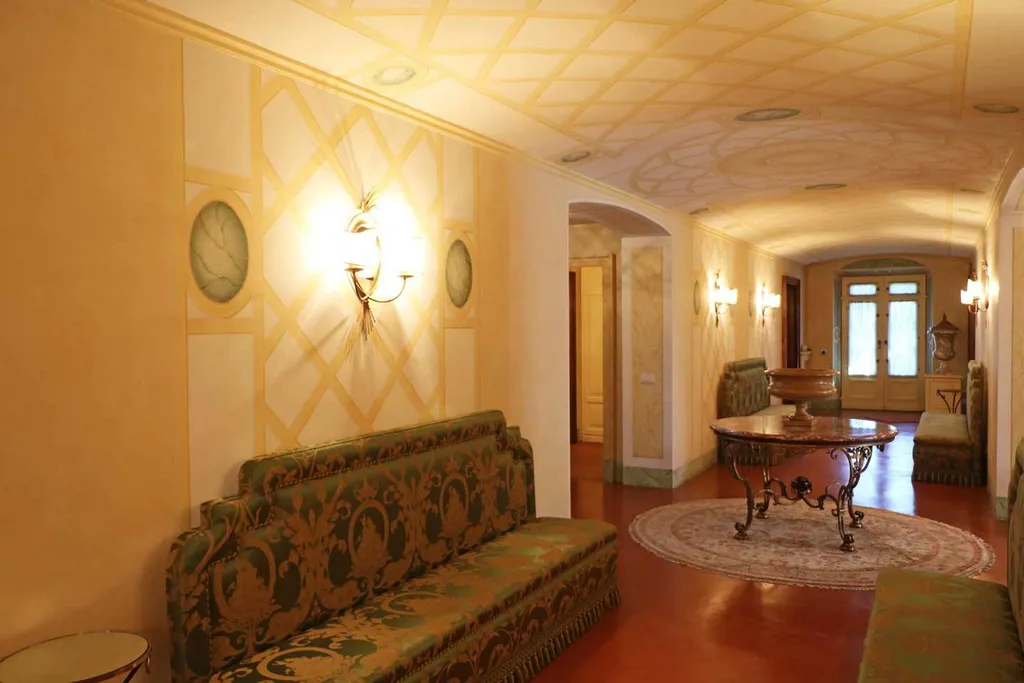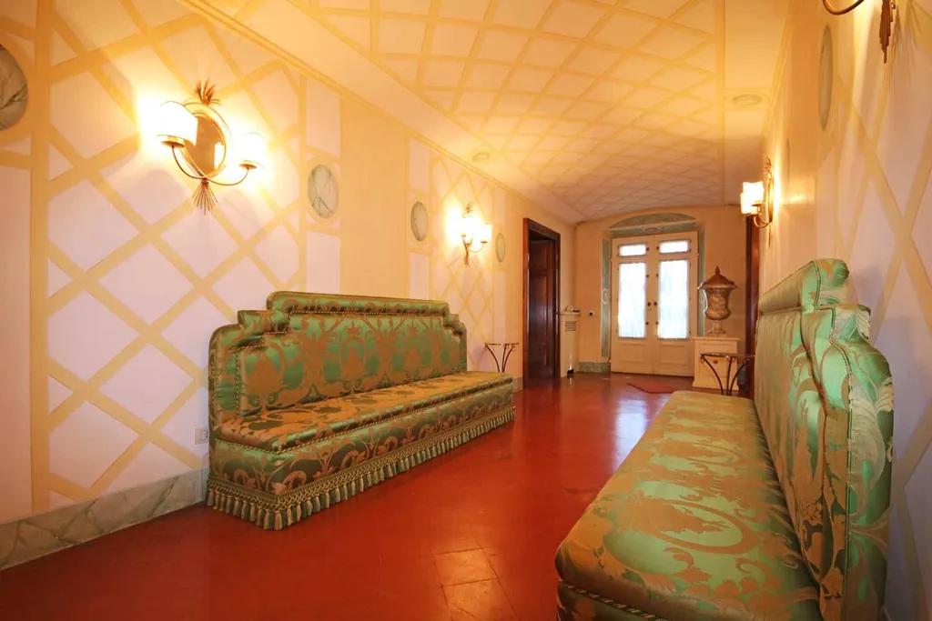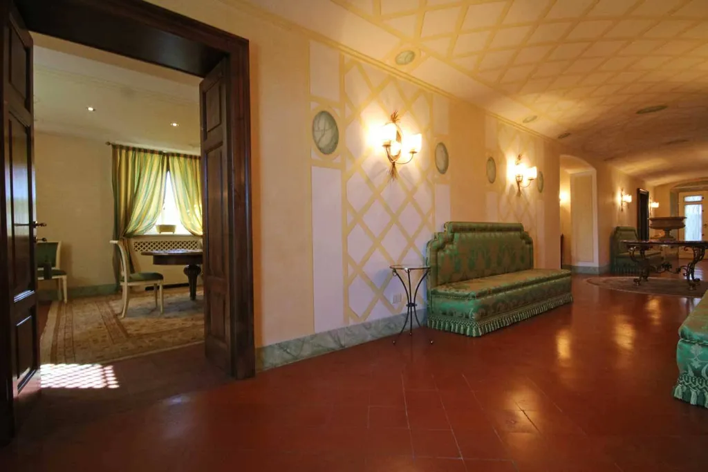 Lingresso presenta un lungo ed ampio corridoio che attraversa la dimora in tutta la sua lunghezza, confluendo nel giardino retrostante bordato da ortensie. Ai lati del corridoio si sviluppano gli ambienti che stupiscono per la loro raffinatezza capace di coniugare il fascino dellantico e la funzionalità del presente. La sala del biliardo anticipa quella dedicata allospitalità: limportante tavolo che la abita è realizzato in un unico pezzo e accoglie al suo cospetto un alto numero di commensali.