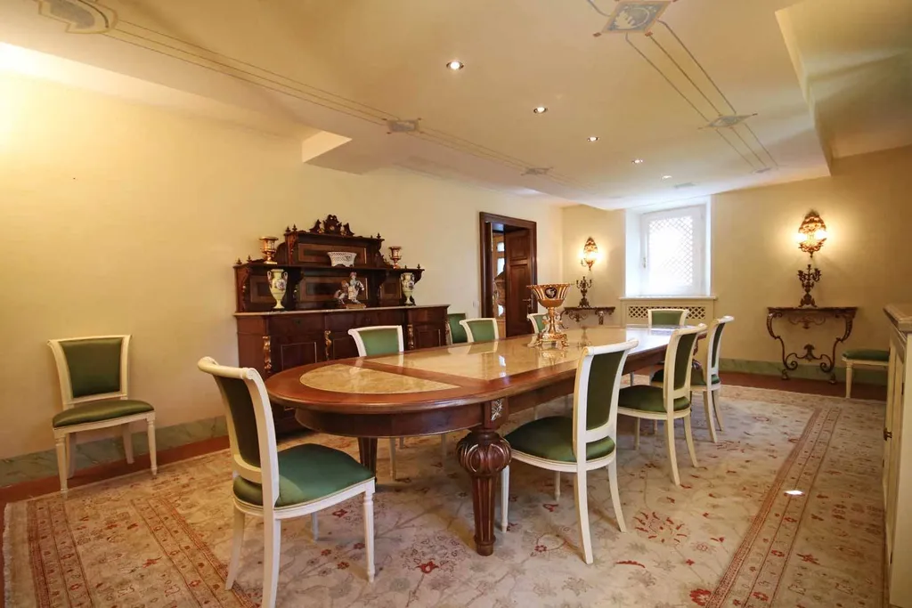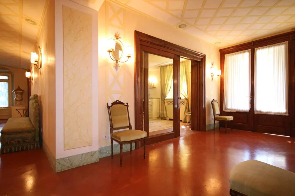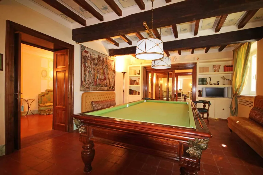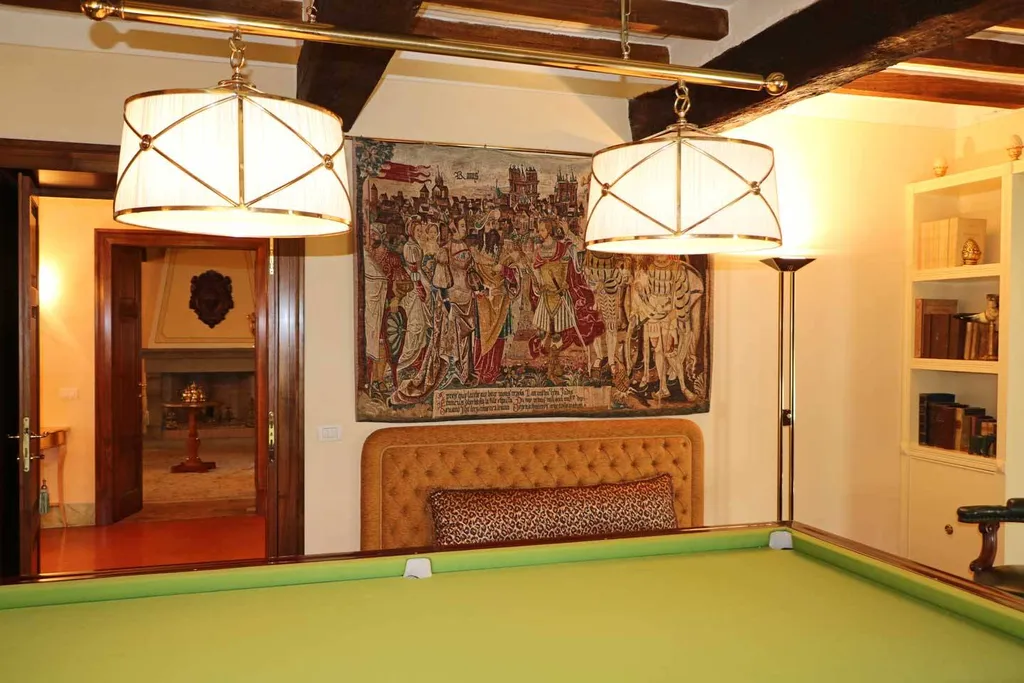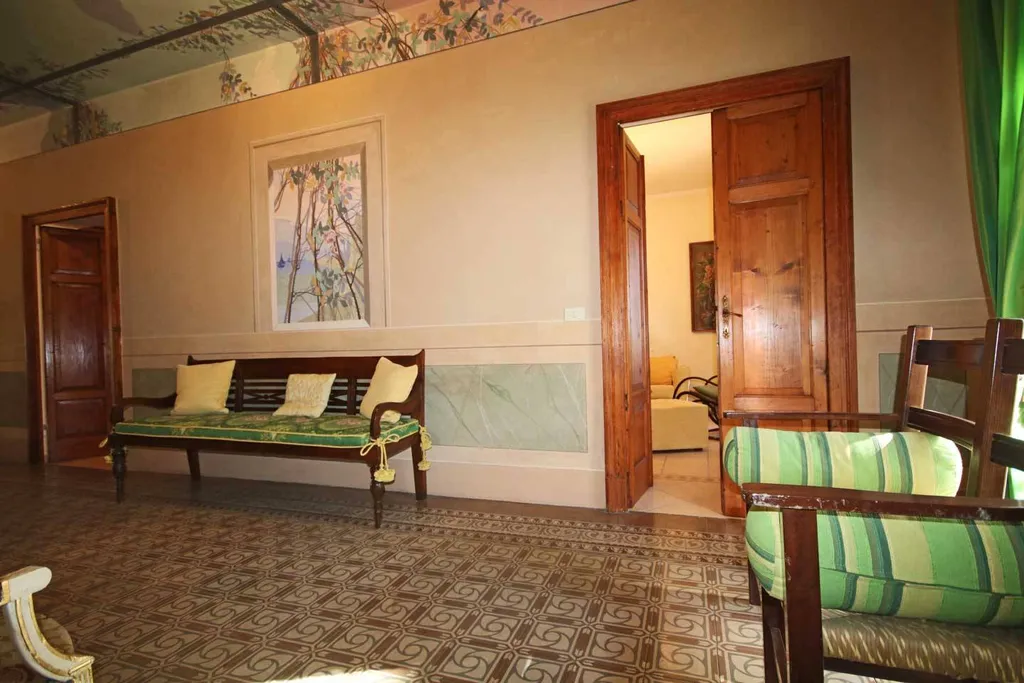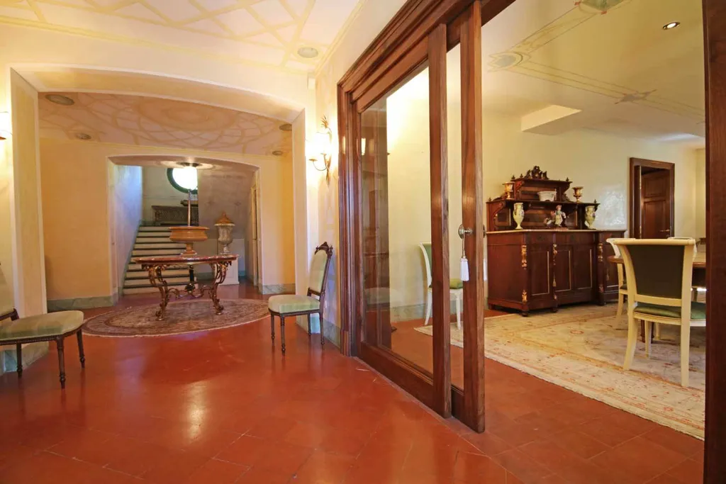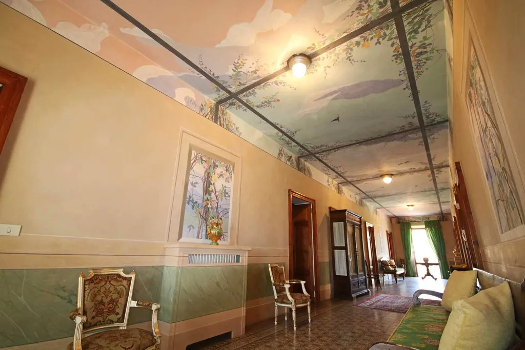 Lingresso presenta un lungo ed ampio corridoio che attraversa la dimora in tutta la sua lunghezza, confluendo nel giardino retrostante bordato da ortensie. Ai lati del corridoio si sviluppano gli ambienti che stupiscono per la loro raffinatezza capace di coniugare il fascino dellantico e la funzionalità del presente. La sala del biliardo anticipa quella dedicata allospitalità: limportante tavolo che la abita è realizzato in un unico pezzo e accoglie al suo cospetto un alto numero di commensali.