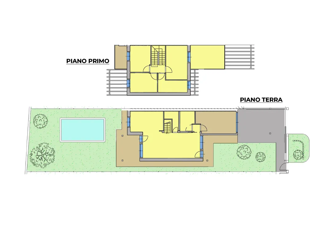 Piano primo: camera matrimoniale con bagno privato, cabina armadi e terrazzo, altre due camere doppie e un altro bagno.