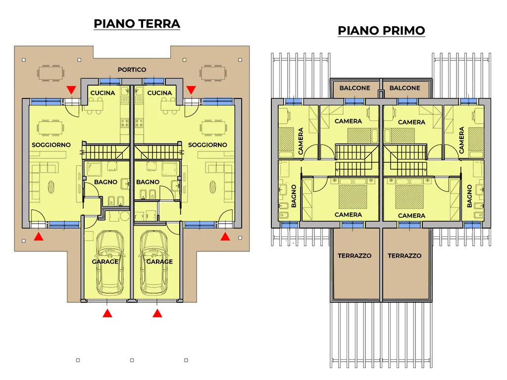 Piano terreno: soggiorno, cucina abitabile, bagno, lavanderia e garage.