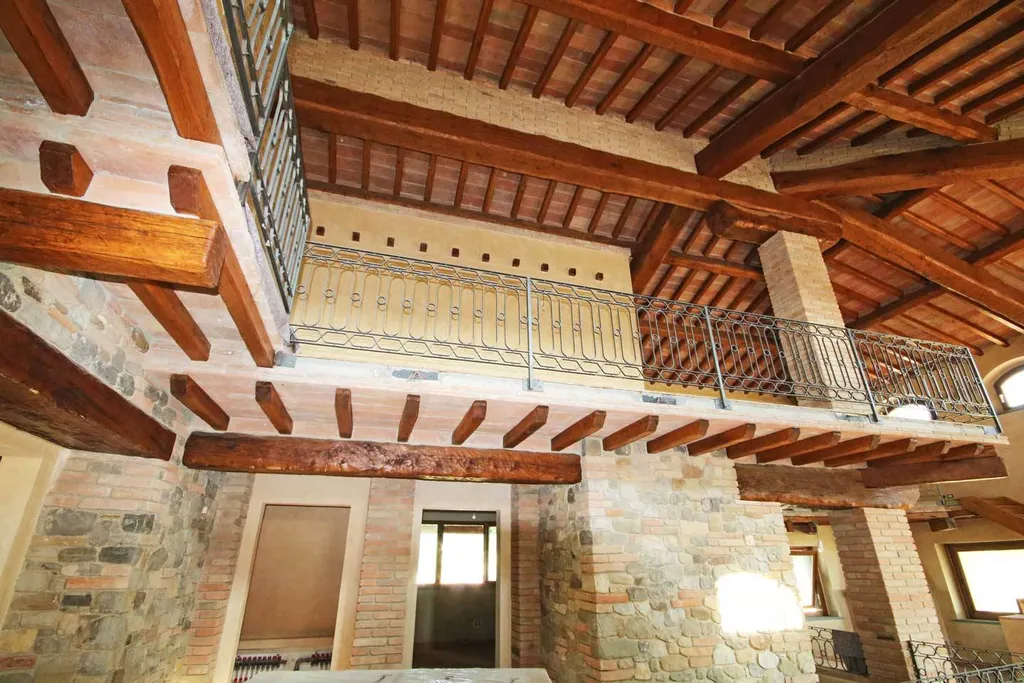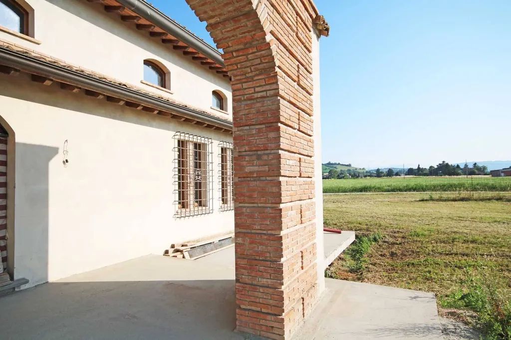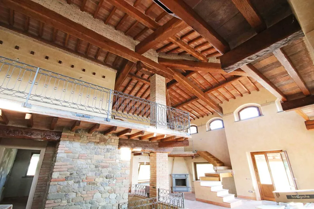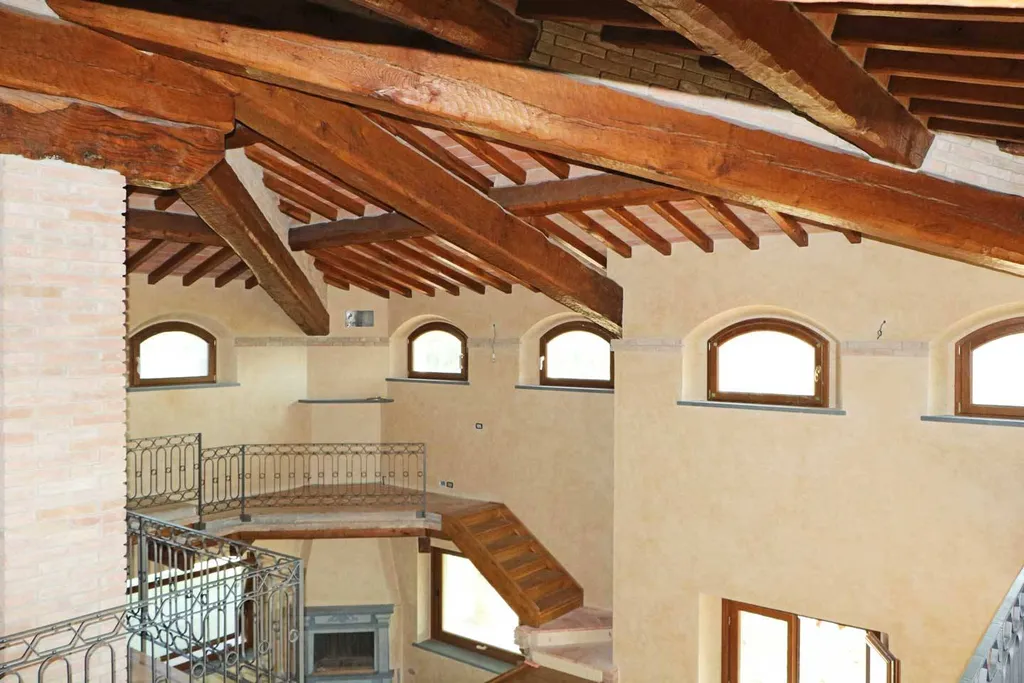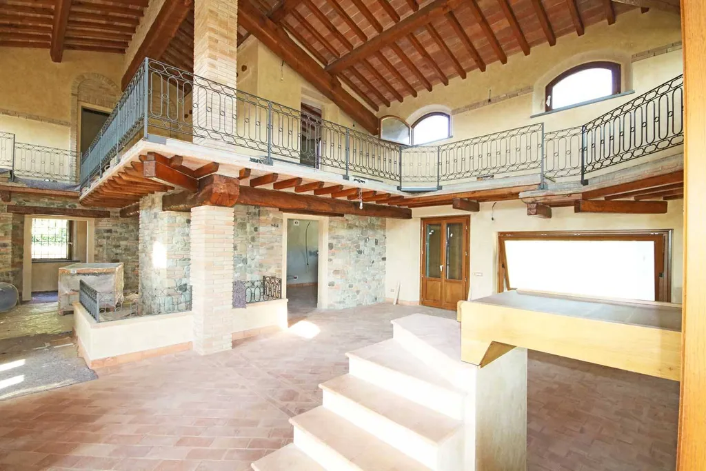 La linea progettuale della villa, di nuova costruzione e mai abitata, è ispirata all architettura tipologica dei fabbricati rurali del territorio, valorizzati dall utilizzo di materiali naturali, quali sassi, vecchi mattoni di cotto, pianelle, travature legnee, che partecipano a creare un effetto d insieme ed antica memoria. .Gli interni basati su un equilibrio di raffinatezza e rusticità presentano unorganizzazione ordinata ed armoniosa, animata da giochi di colore e luce che favoriscono il massimo confort e la migliore abitabilità. L ingresso è ampio in diretta comunicazione con la grande area giorno.