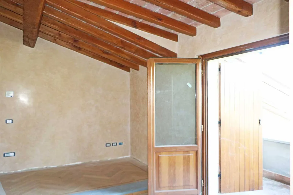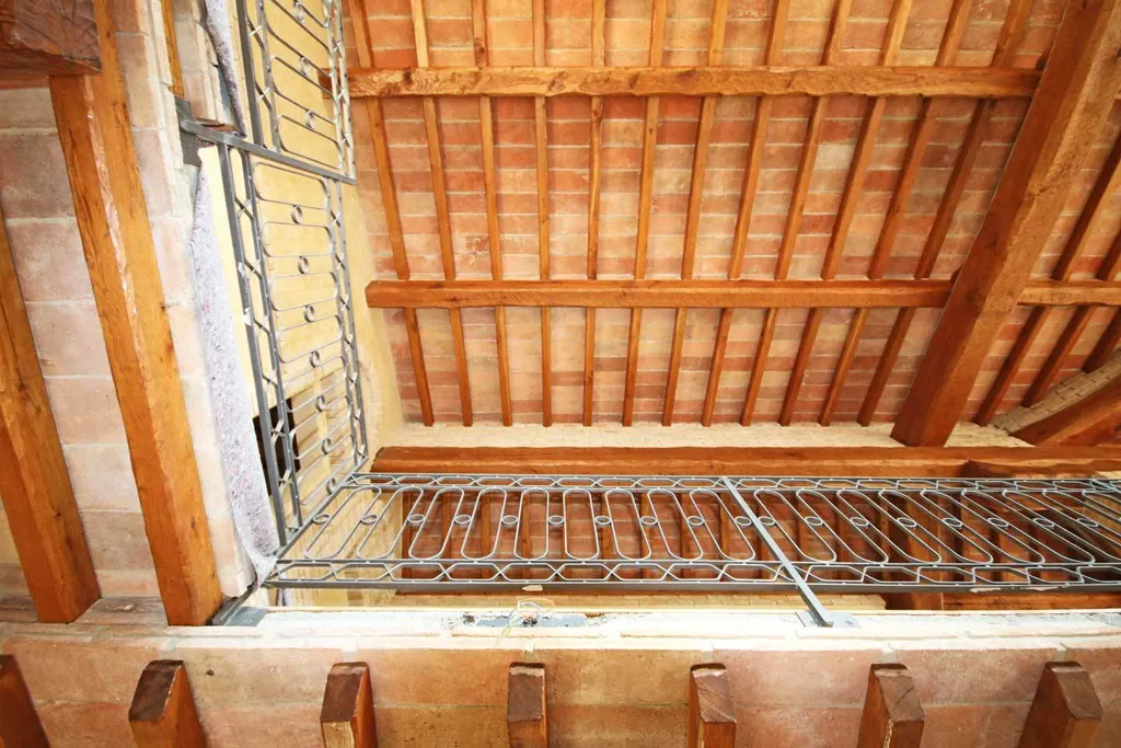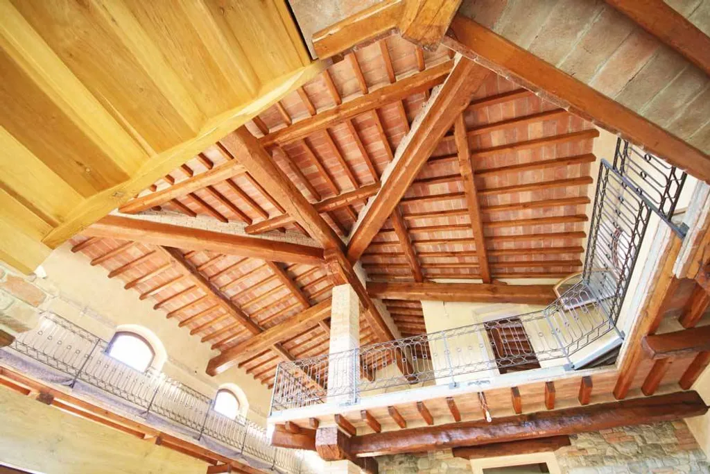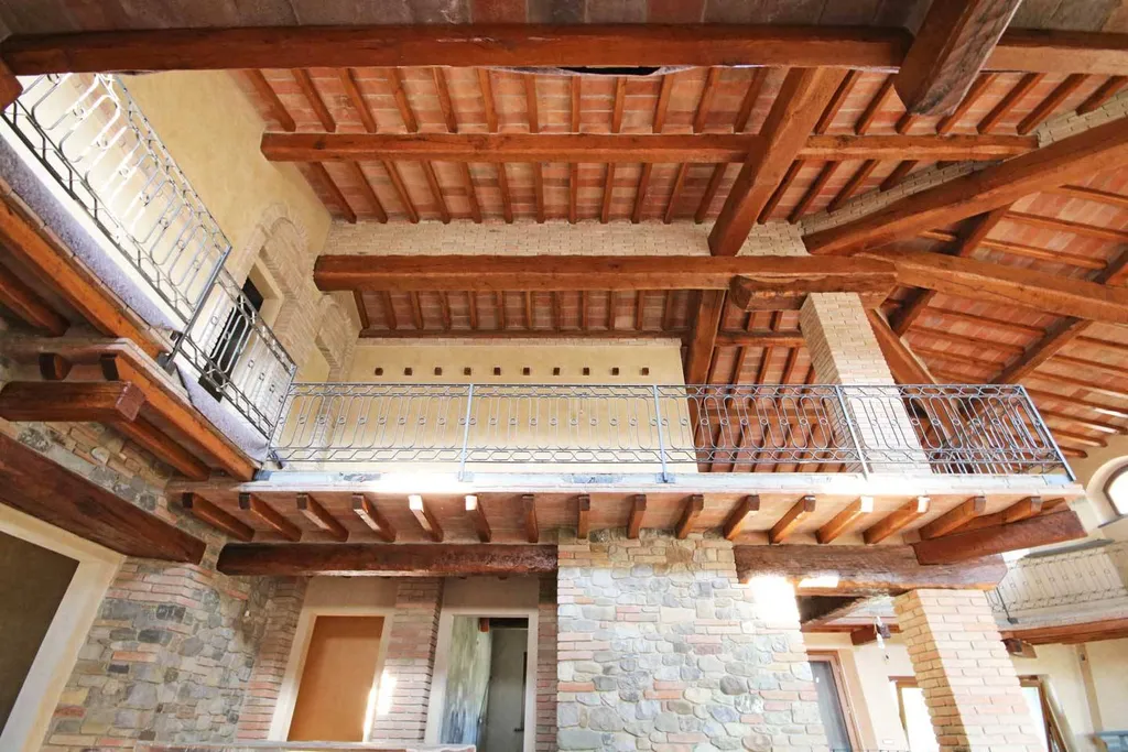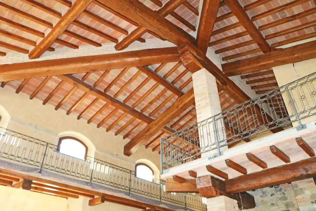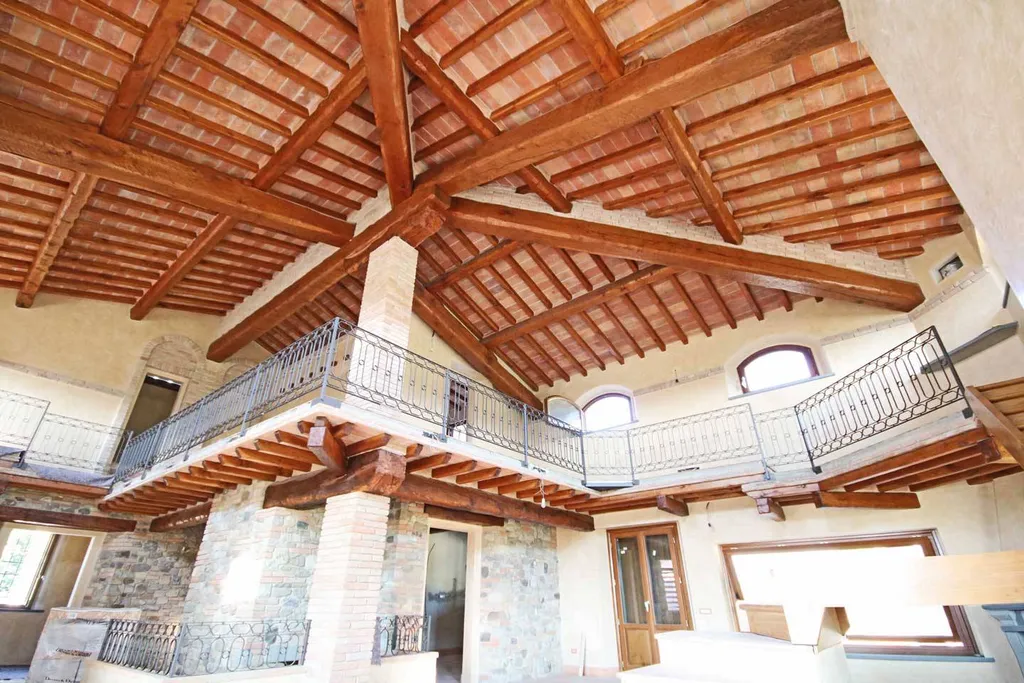 P.Rialzato. (215 mq.): ingresso che si apre sull affascinante salone di oltre 100 mq. utili, l insieme dominato da spaccati di muratura in sasso e mattone a vista, ed imponenti travature lignee a vista.