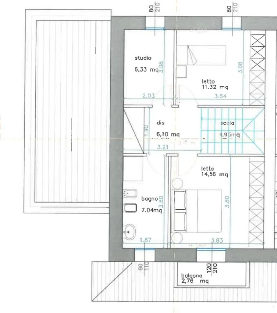 Salendo al primo piano, con superficie di 67 mq, troviamo la zona notte composta da disimpegno, camera matrimoniale di 14 mq circa con balcone privato, camera singola di 11 mq, camera/studio di 7 mq e secondo bagno finestrato.