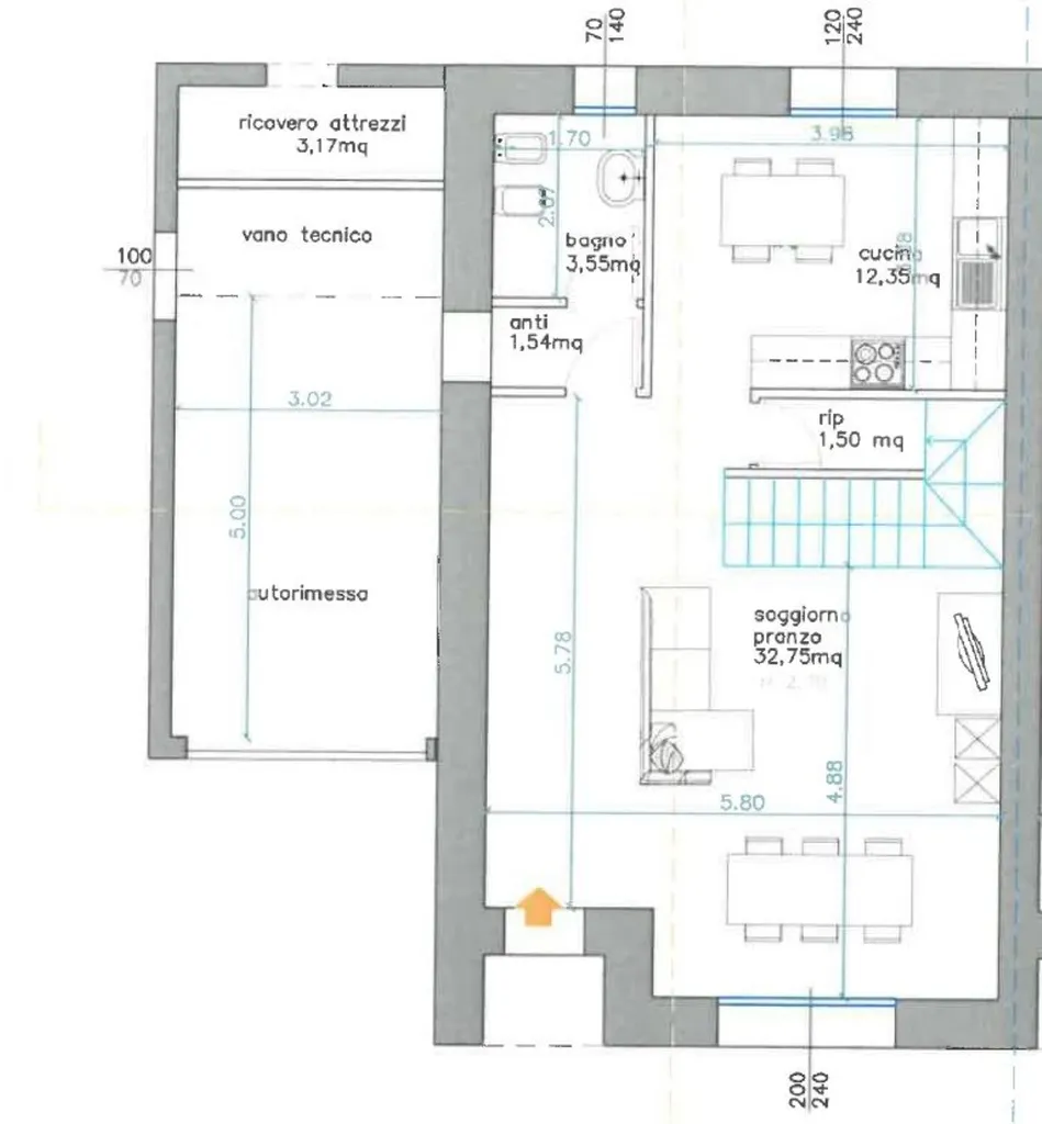 L'immobile, al piano terra, è suddiviso in ingresso da ampio porticato, soggiorno di oltre 30 mq, cucina abitabile di 13 mq aperta sulla zona giorno, ripostiglio, antibagno e bagno finestrato.
