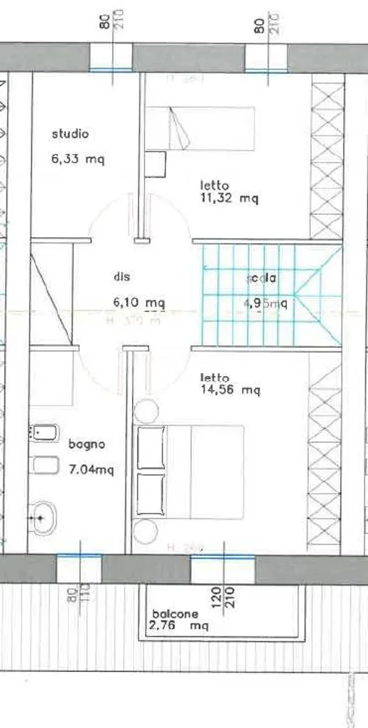 al primo piano di circa 64 mq disimpegno notte, camera matrimoniale di 14,50 mq con balcone, camera singola di 11,30 mq e studio di 7 mq circa, bagno finestrato e armadio a muro/riposiglio.