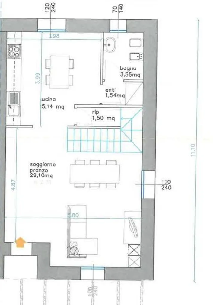 ingresso tramite giardino e porticato, ampio soggiorno di 28 mq, cucina abitabile di 15 mq aperta sul soggiorno, anti bagno e bagno finestrato, ripostiglio